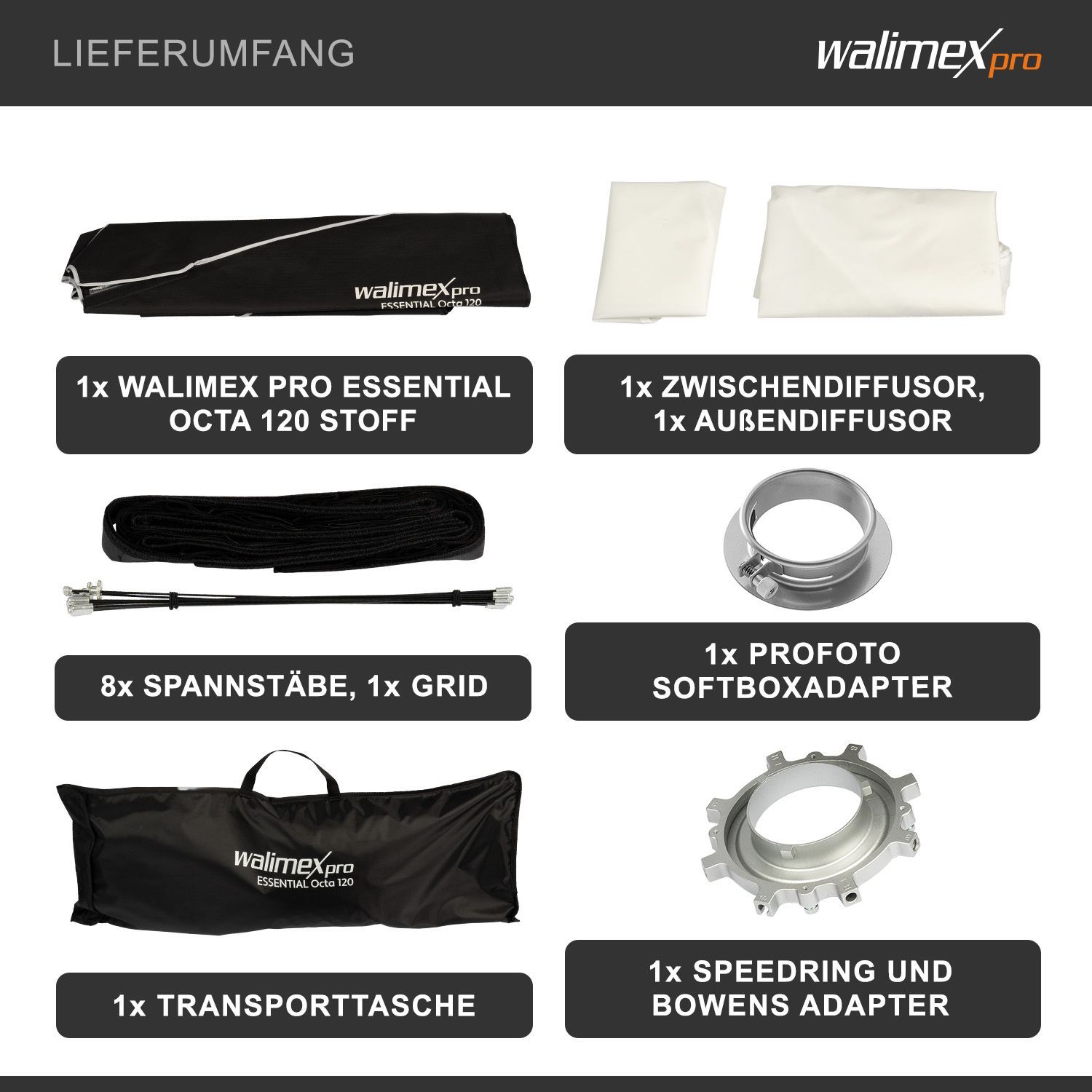Walimex pro Essential Softbox Octagon 120cm 360° einfacher Aufbau Grid Profoto