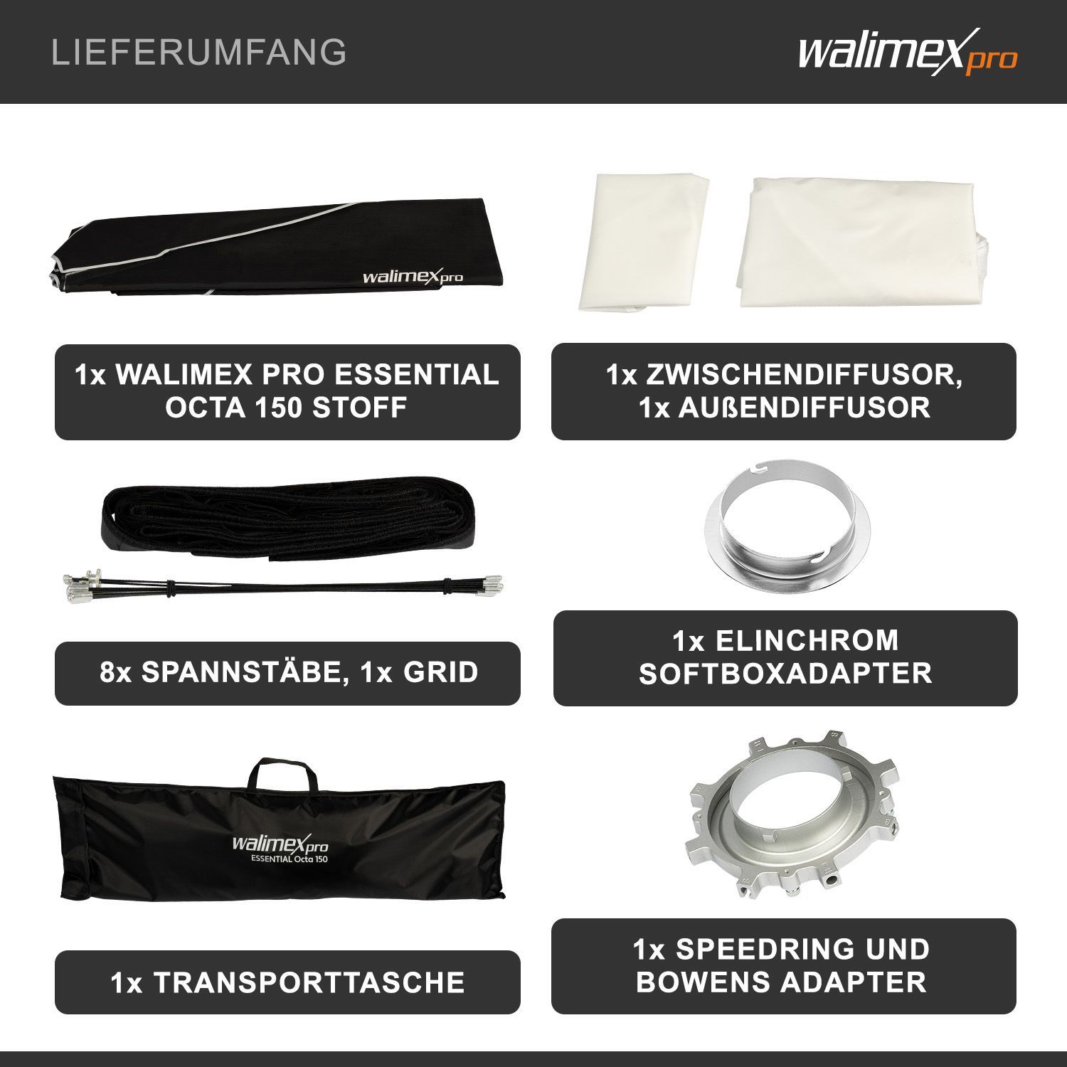 Walimex pro Essential Softbox Octagon 150cm 360° einfacher Aufbau Grid Elinchrom