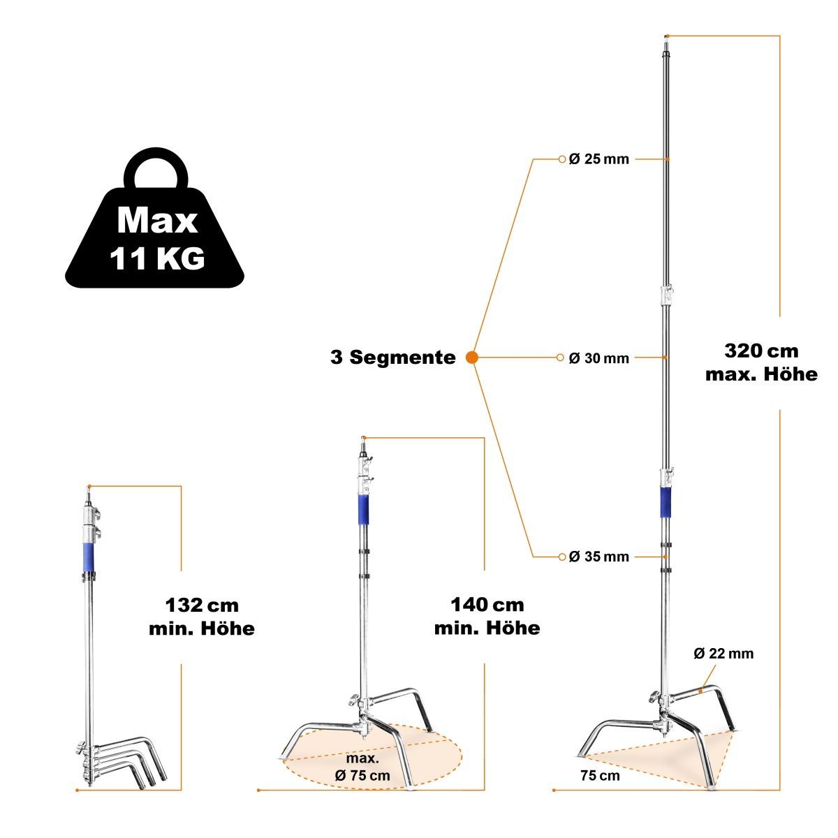 Walimex pro Lampenstativ silberfarben 75x75x140cm 11kg 5/8" Spigot Century Stand