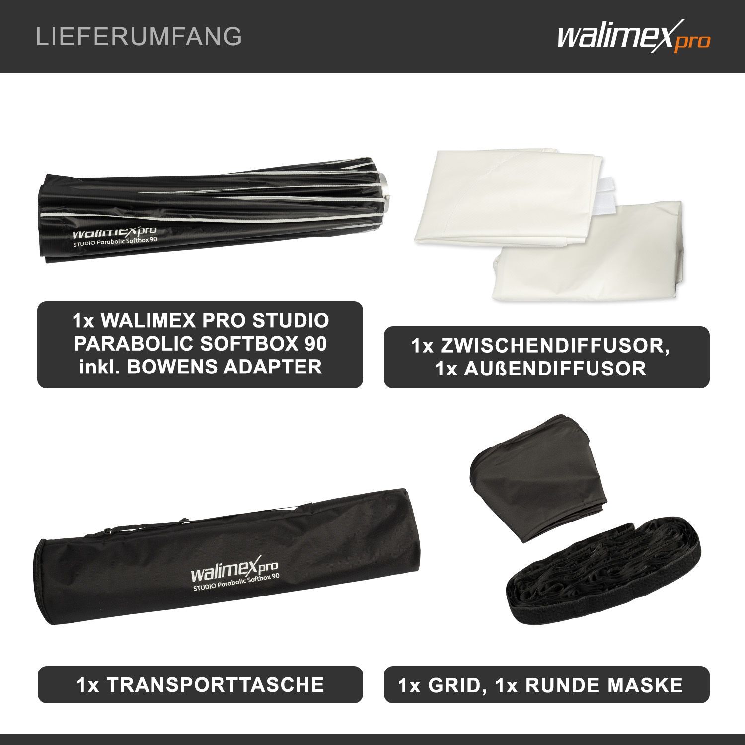 Walimex pro Studio Parabolic Softbox 90cm 360° Schirmfunktion Grid Maske Bowens
