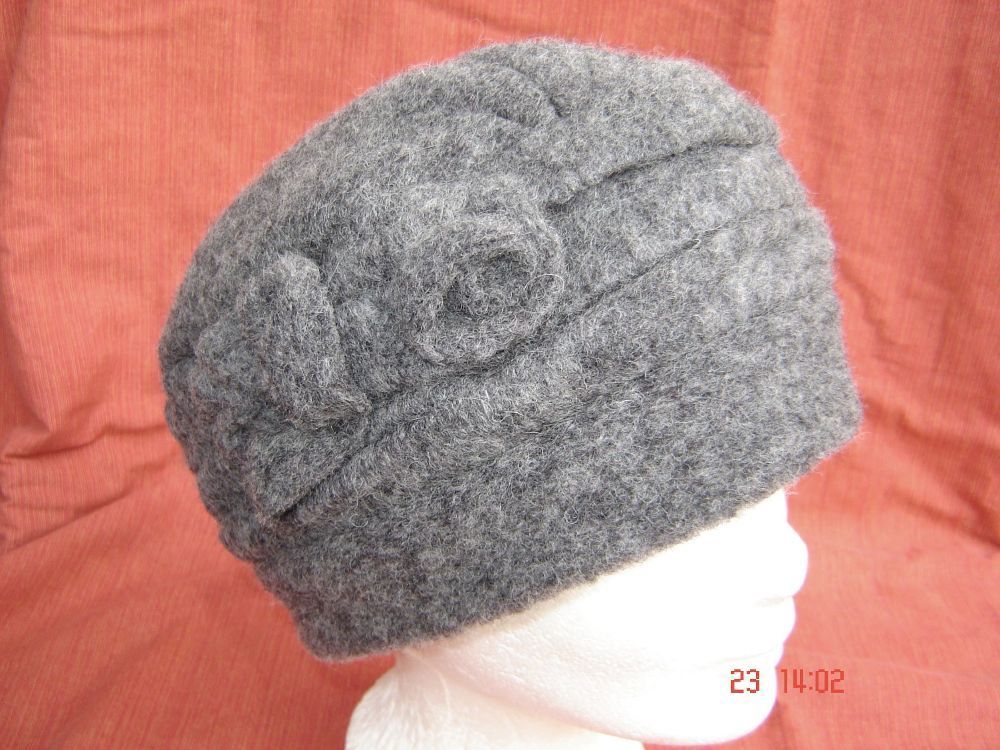 . Walkhut kuschlig warme Walkmütze hohe geräumige Form, passt sehr gut wunderschön dekoriert mit Walkapplikation Walk weiche Qualität aus 75% Wolle und 25% Polyester mit weichem Fleecefutter , 100% Polyester problemlose Handwäsche in Farbe grau Größen passend für 57 , 58 oder 59 cm Kopfumfang . Bitt