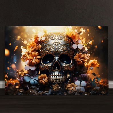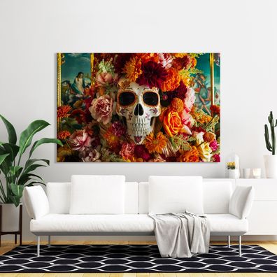 Moderne Wandbild, Totenkopf mit Blumen, Kunst Poster, Leinwand, Acrylglas