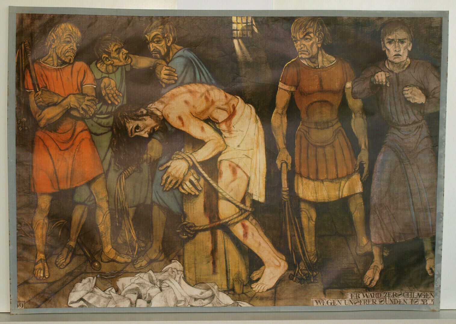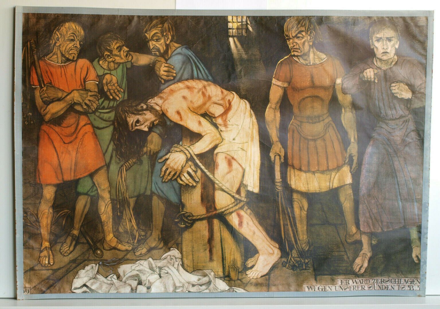 Wandbild Bibel Testament 69 Er ward zerschlagen wegen unserer Sünden IS 53,5 siehe in der Liste NrL979 unter HV 69 (PA714) 1.-2. Bild , 3.-5. Bild zur Veranschaulichung der Größe beigefügt Genesis 1.Buch Mose, Lukas, Matthäus, Exodus, Kapitel, Vers usw. Bibelgeschichte in 80 Bildern, Herder-Verlag,