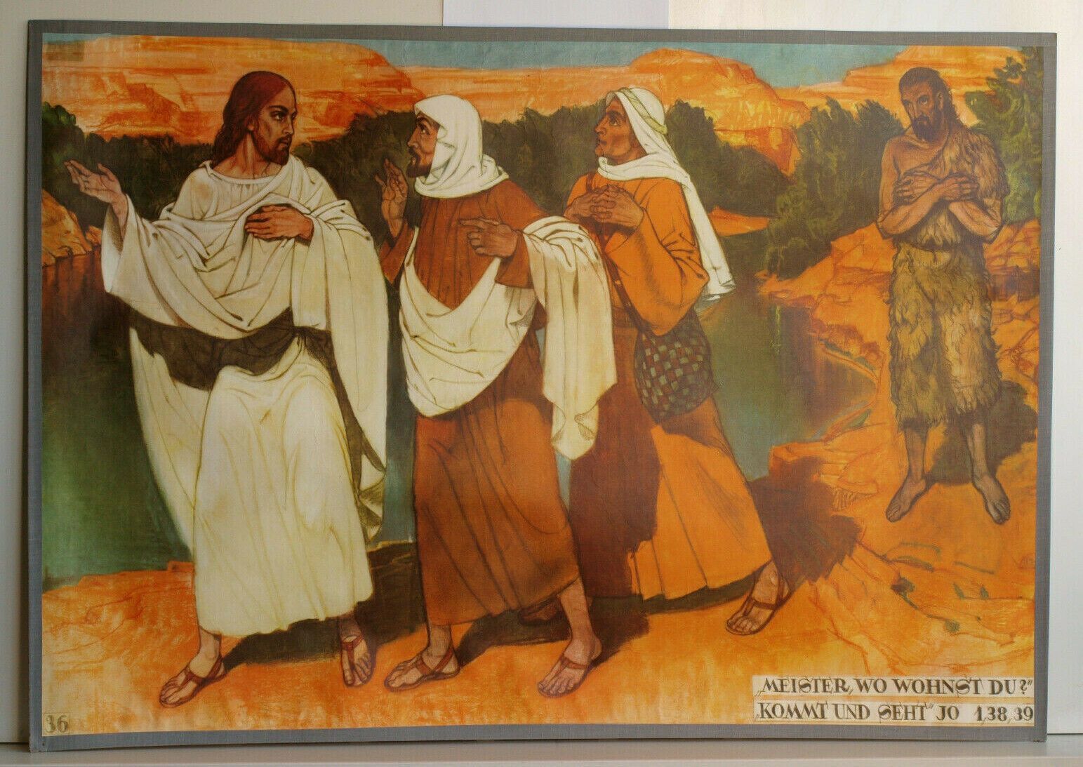 Wandbild Bibel Testament Kirche 36 Meister, wo wohnst DuEuro Komm und seht JO 1. 38 siehe in der Liste NrL979 unter HV 36 (PA649) 1.-2. Bild , 3.-5. Bild zur Veranschaulichung der Größe beigefügt Genesis 1.Buch Mose, Lukas, Matthäus, Exodus, Kapitel, Vers usw. Bibelgeschichte in 80 Bildern, Herder-V