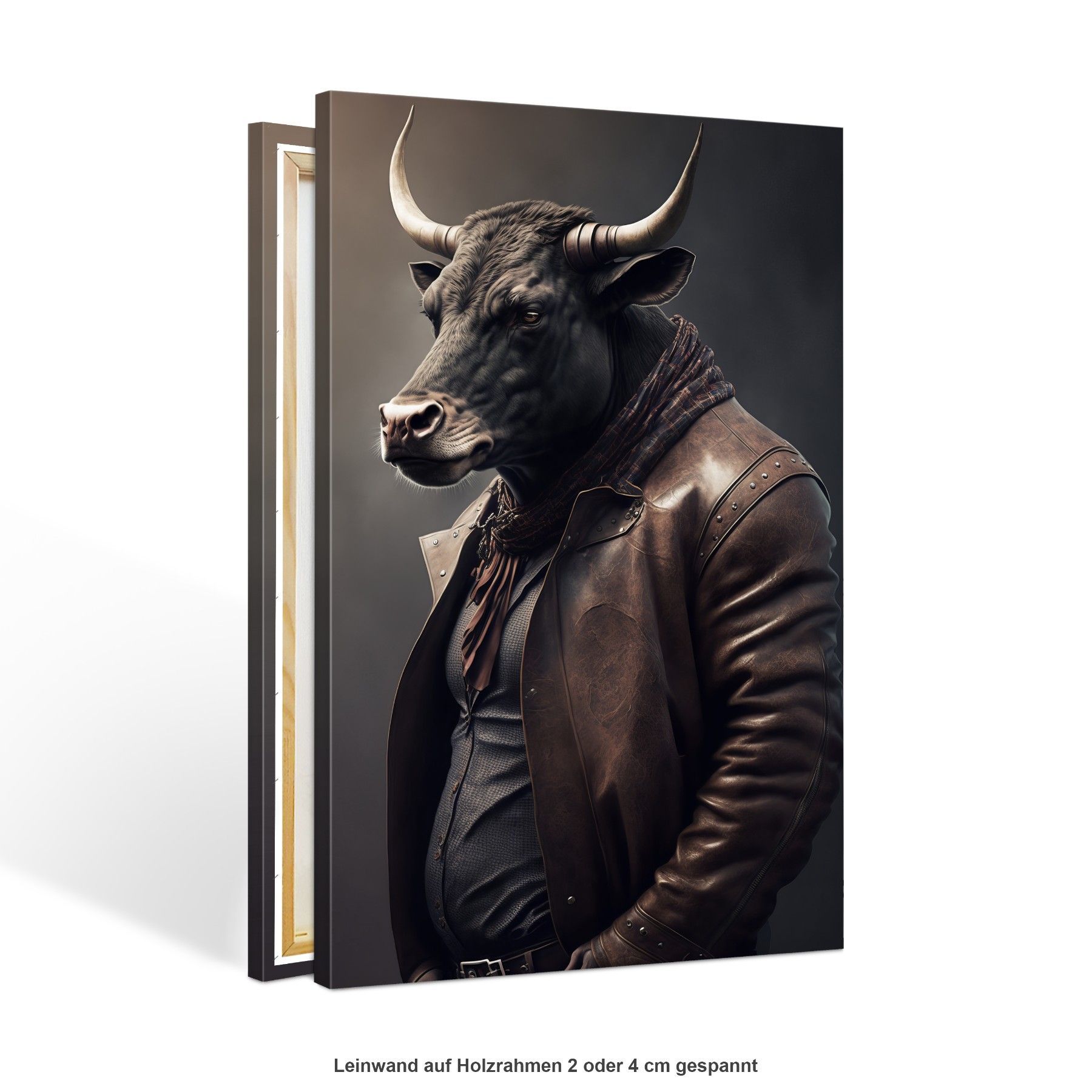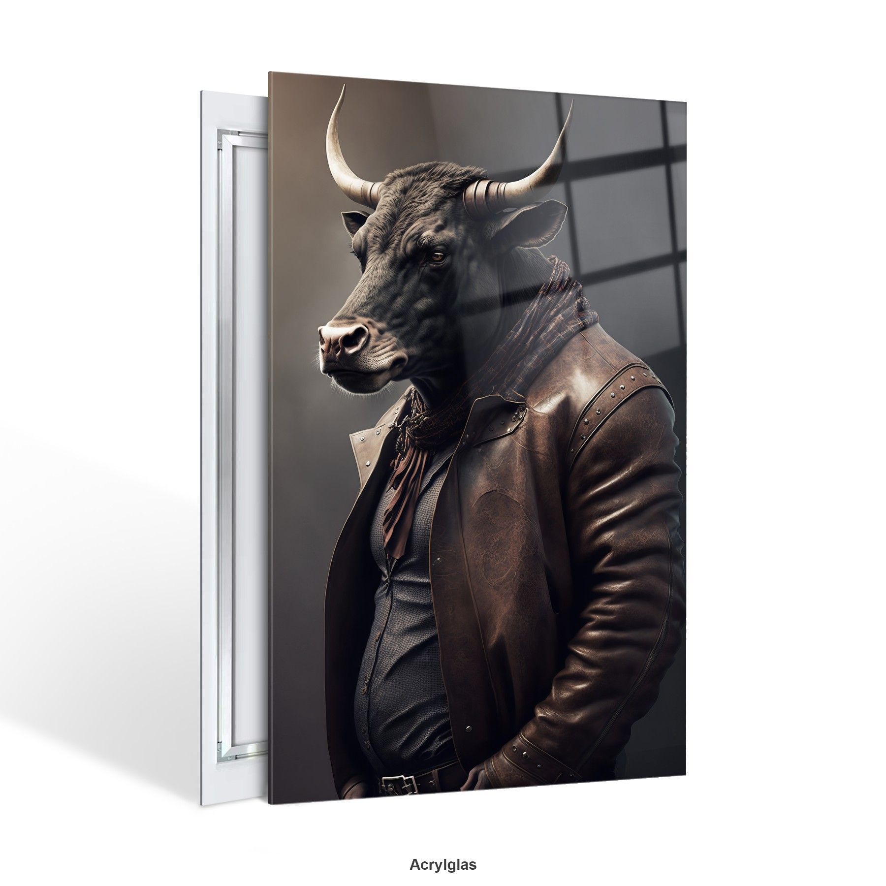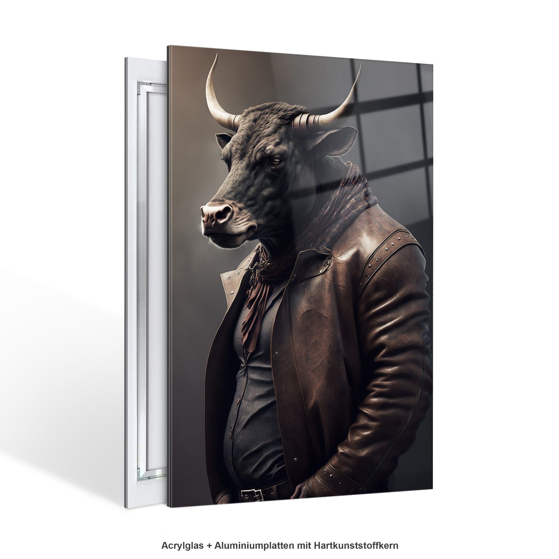 Wandbild Stier trägt eine Jacke Business Leinwand , Acrylglas + Aluminium, Poster