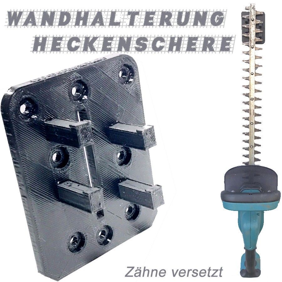 Wandhalterung für Heckenschere Universell einsetzbar für Heckenscheren mit versetzt angeordneten Zähnen . (Alternativ gibt es von uns eine mit gleich angeordneten Zähnen) Bitte überprüfen Sie, wie Ihre Verzahnung ist und ob die Abstände passen Grundplatte 6 mm Stark mit 4 Haltebolzen in der die Heck