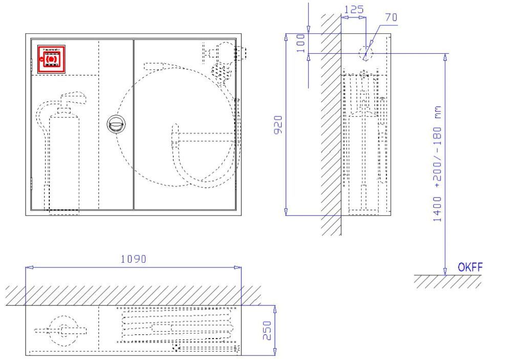 Aufputzschrank Bauart C 1090 x 920 x 250 mm (Breite x HoEurohe x Tiefe) nach DIN 14461-1. Aus 1 mm verzinktem Stahlblech gekantet und verschweißt, frontseitige StoEuroße verschweißt und verschliffen. BeluEuroftung uEurober TuEurorspalt. Vier Montagebohrungen in der RuEurockwand. Aufnahme fuEuror Sch