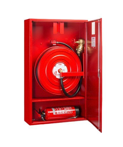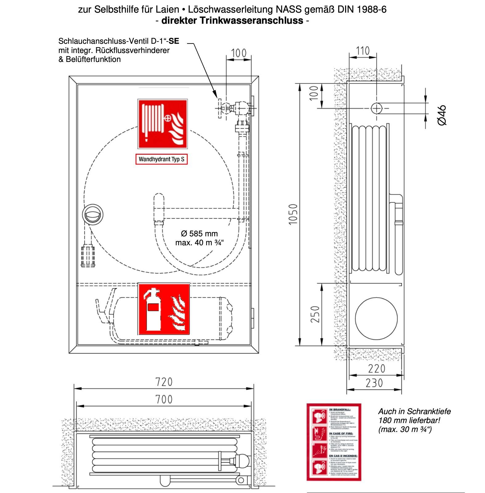 Wandhydranten mit formstabilem Schlauch Typ S nach DIN 14461-1 mit Schlauchhaspel nach DIN EN 671-1 zum Anschluss an die Trinkwasserleitung nach DIN 1988-6 zur Erstbrandbekämpfung durch Laien Aufputzschrank Bauart C, inkl. Feuerlöscherfach unten 740 x 1.240 x 220 mm (Breite x Höhe x Tiefe) nach DIN