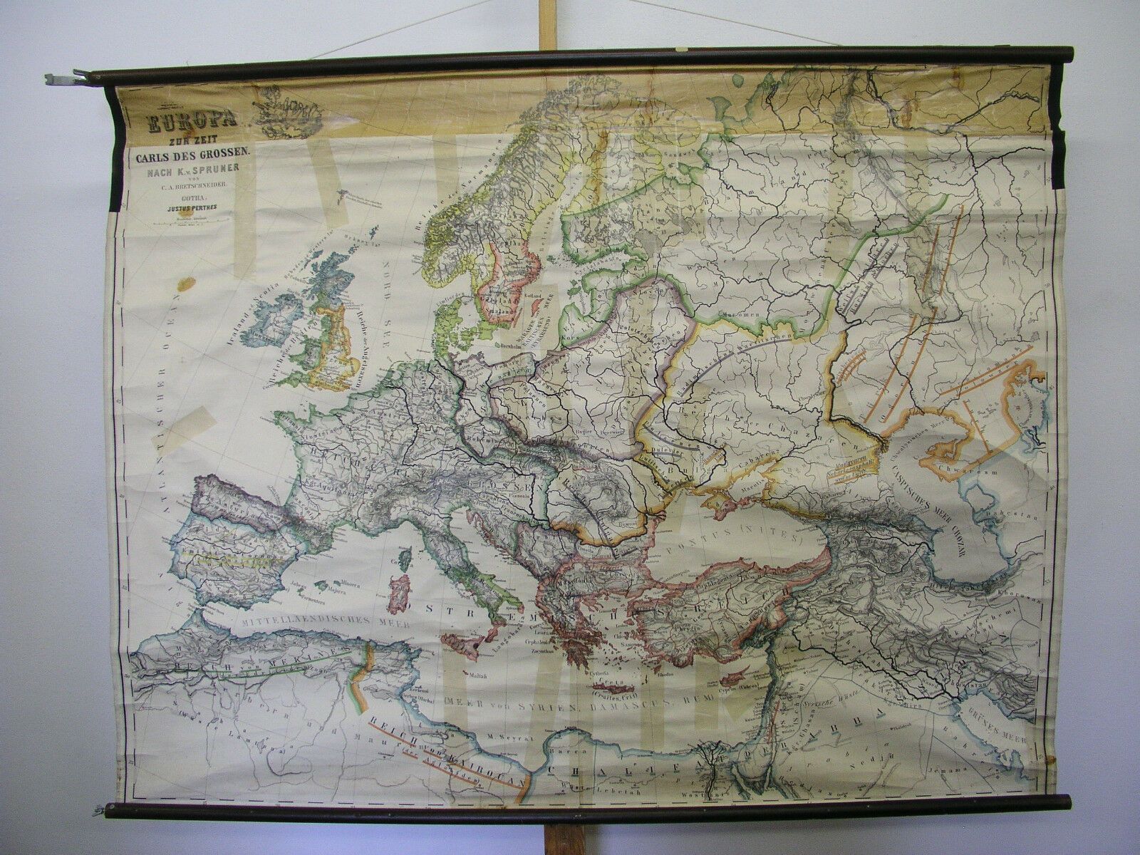 Wandkarte alte Europakarte Karl der Große um 800 157x126 1940 vintage v.Spruner Siehe in der Liste unter Nr. 1000 Europa zur Zeit Carls des Grossen (SE382) Kartensammler (allumfassend...speziell deutsche bezahlbare Karten ab 1900) verkauft hier seine doppelten Exemplare der Schulwandkarten ( Wandkar