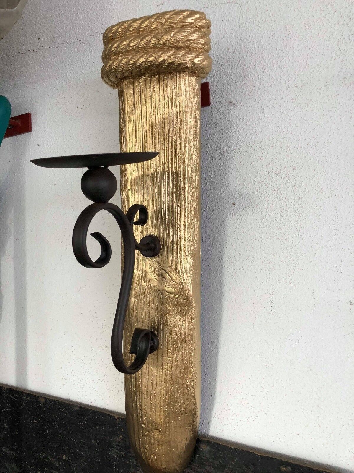 XXL Kerzenständer zur Wandmontage ( Aufhänger vorhanden ) Maße: 67,5 x 17 x 24 cm Material: Metall - Goldfarben lackiert Gewicht ca. 3 kg Versand Euro 6,-- Abholung in unserem Ladengeschaeft Retro World in 73563 Mögglingen - Lauterstrasse 27 möglich !