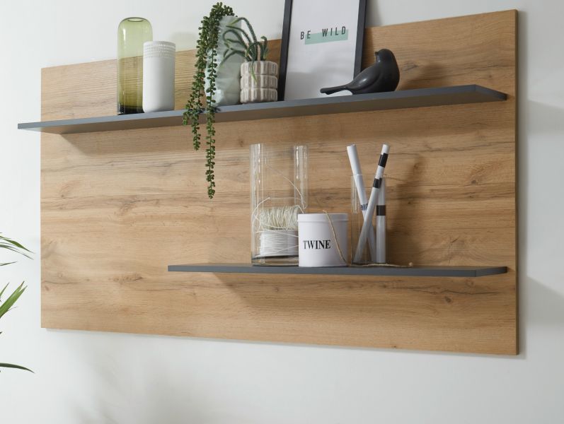 Wandpaneel Wandregal Eiche Wotan und grau TV Rückwand Möbel 155 x 80 cm Center