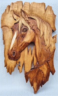 • Holzbild Pferdekopf Wandrelief Schnitzerei Handarbeit Massivholz 30x 45cm