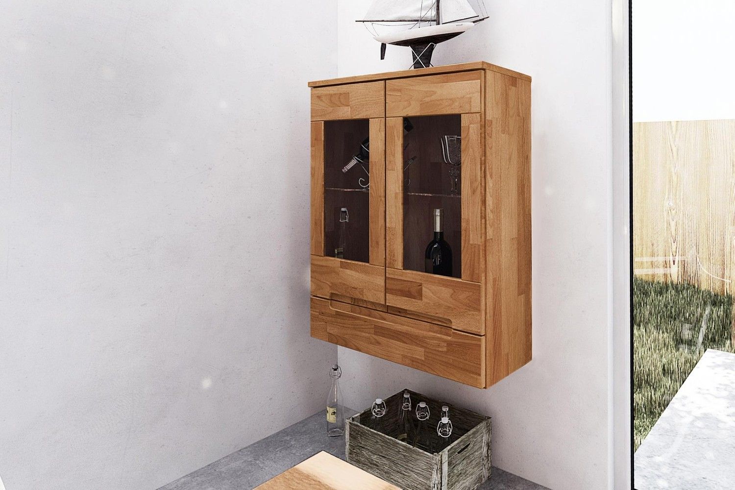 Wandschrank Bento aus Kernbuche massiv 74x32x96 mit 2 Glastüren und 1 Schublade