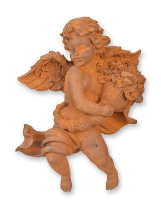 • Ein rostiger Wandhalter aus Gusseisen, auf dem ein Putto mit einem Füllhorn zu sehen