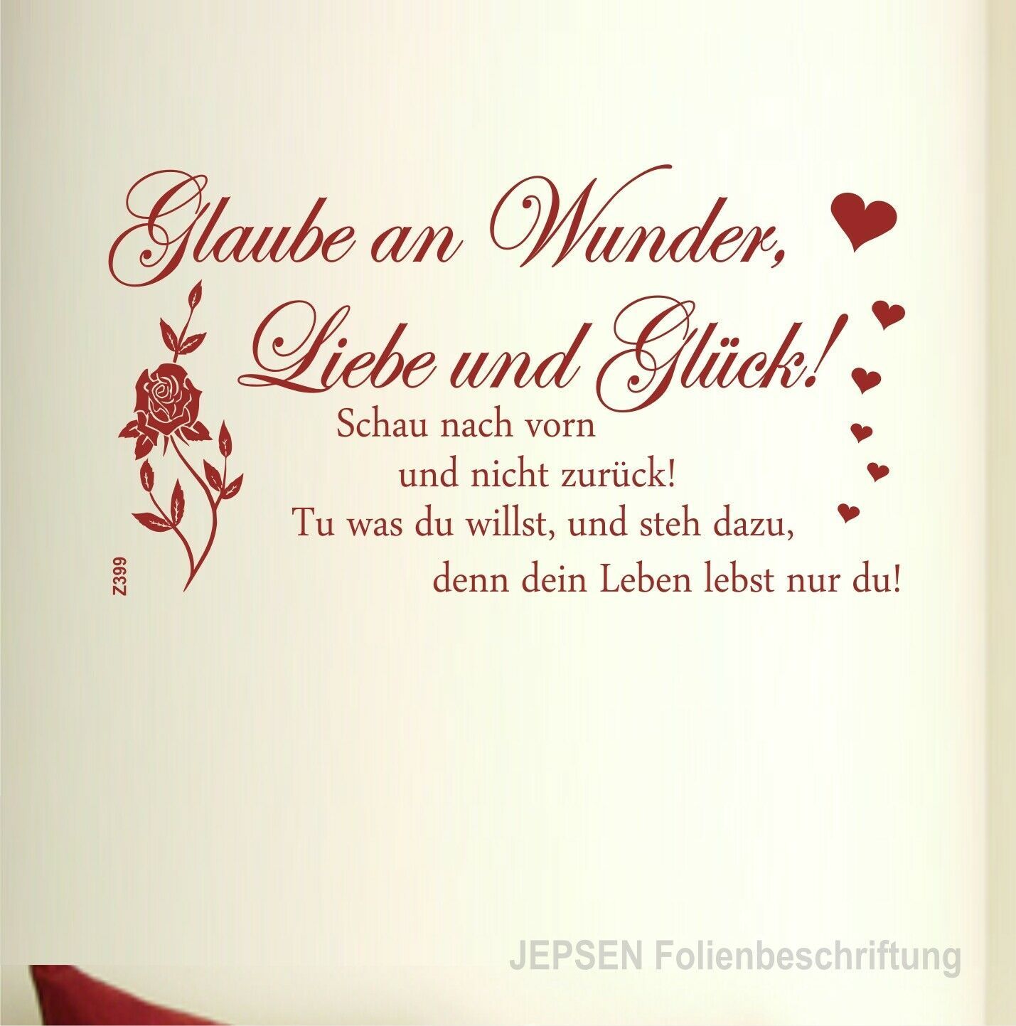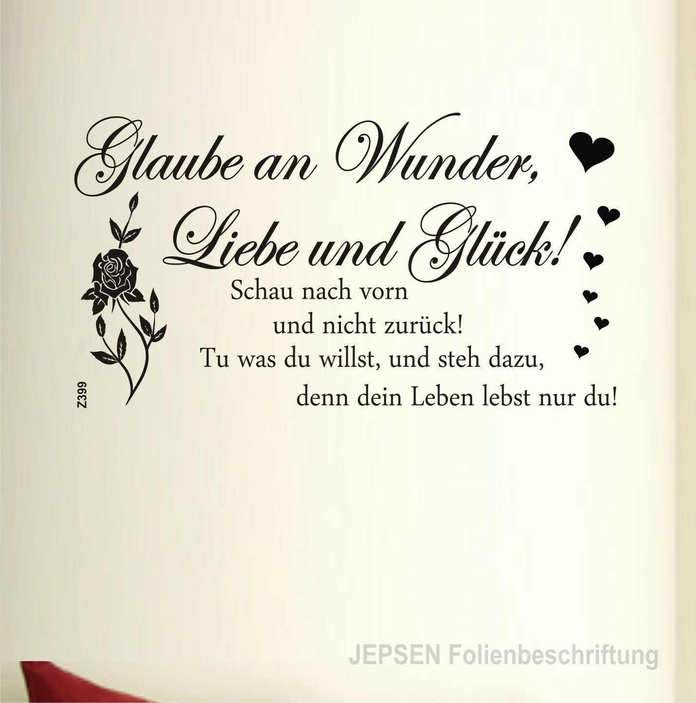 Wandtattoo Z399 Glaube an Wunder, Liebe und Glück! Schau nach vorn und nicht zurück! Tu was du willst, und steh dazu, denn dein Leben lebst nur du! Größe: ca 60x30cm inkl Herzen und Blüte Farbe: nach Wunsch
