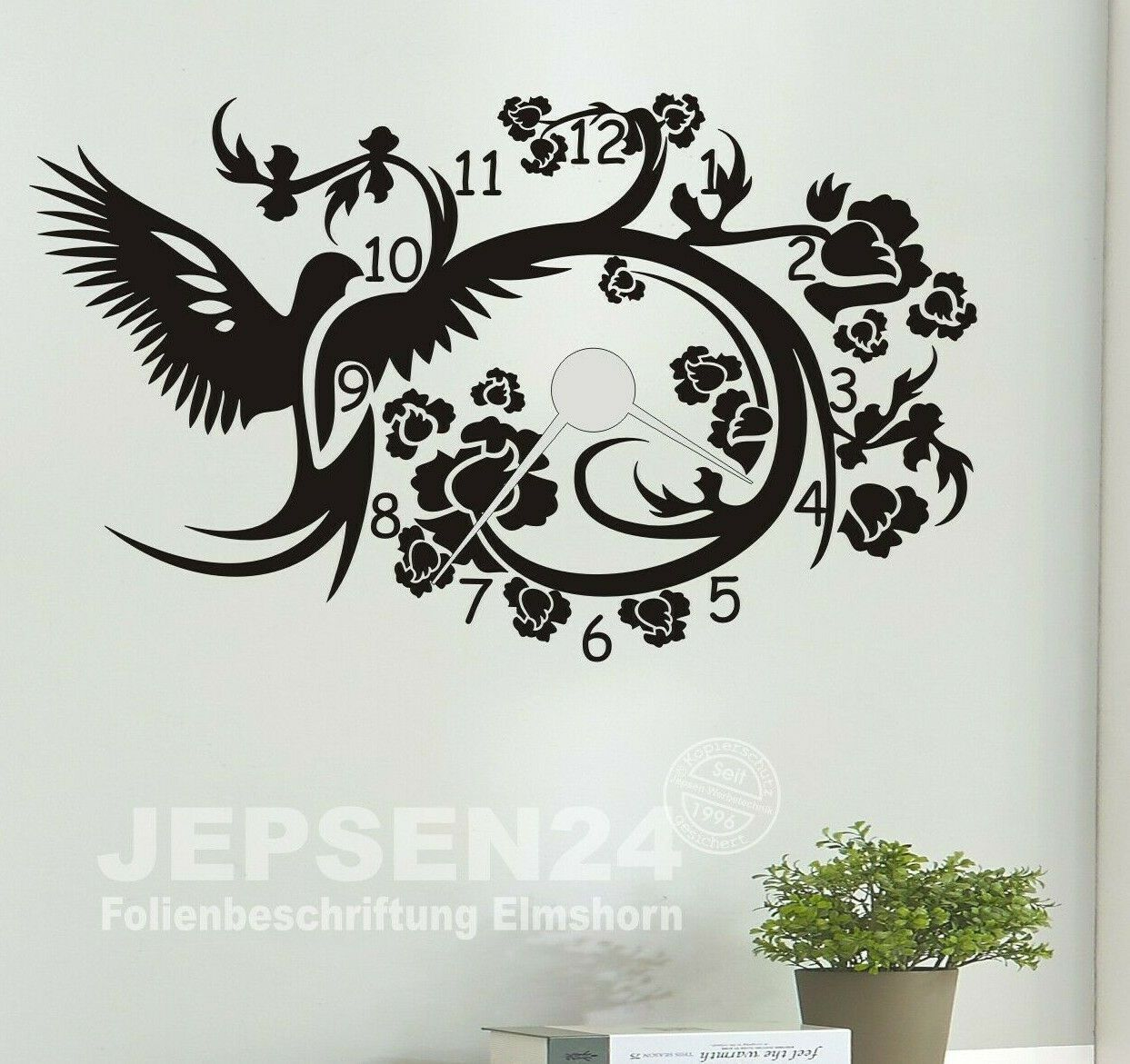 WANDTATTOO Wanduhr mit Vogel / Taube und Blumen inkl Uhrwerk Wandtattoo in Farbe nach Wunsch, inkl Wanduhr von Karlsson, Uhrgehäuse und Zeiger in silber oder schwarz lieferbar. Größe: ca 100x60cm Farbe: Wandtattoo z.B. in schwarz matt, Uhrwerk silber oder schwarz, einfach nach Wunsch mitteilen.