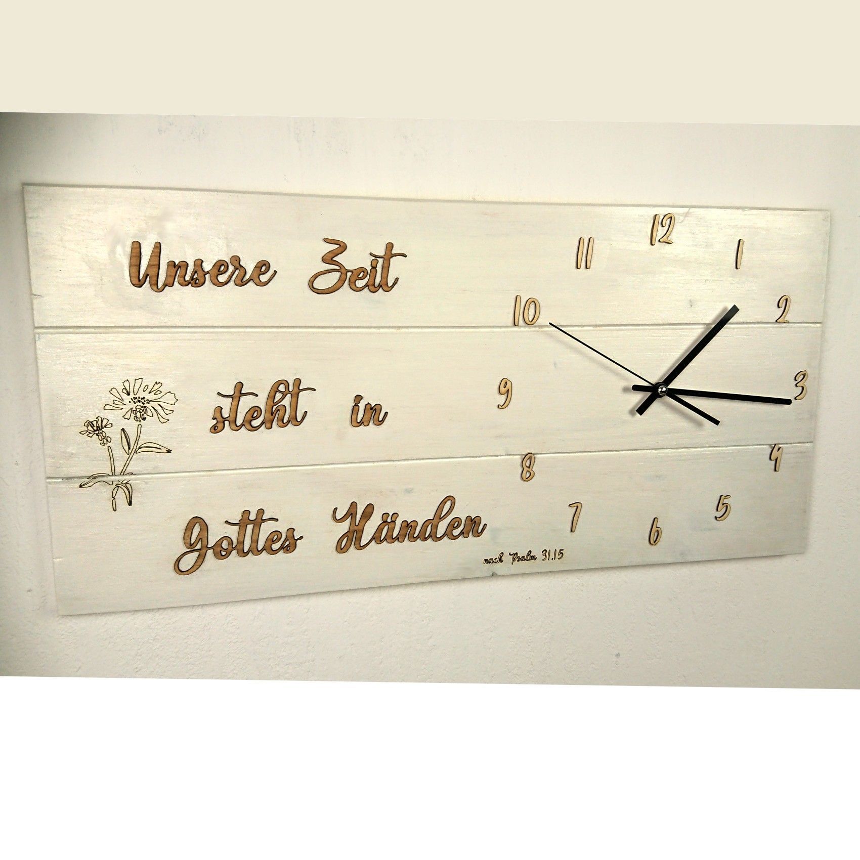 Wanduhr 3D Vers 30x60 Handmade Bibelvers Blume Funkuhr Wohnzimmer Psalm 31,16 Büro