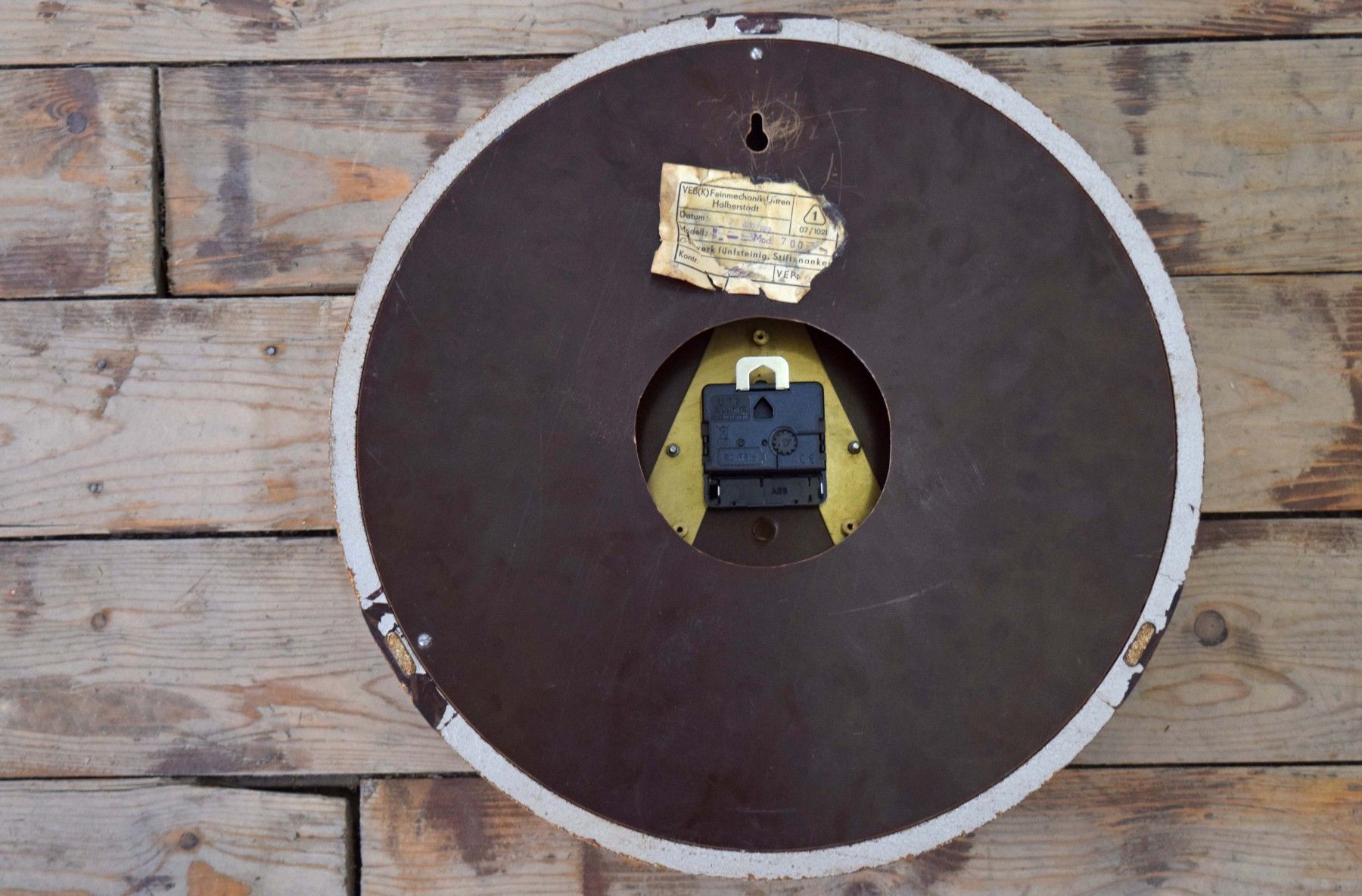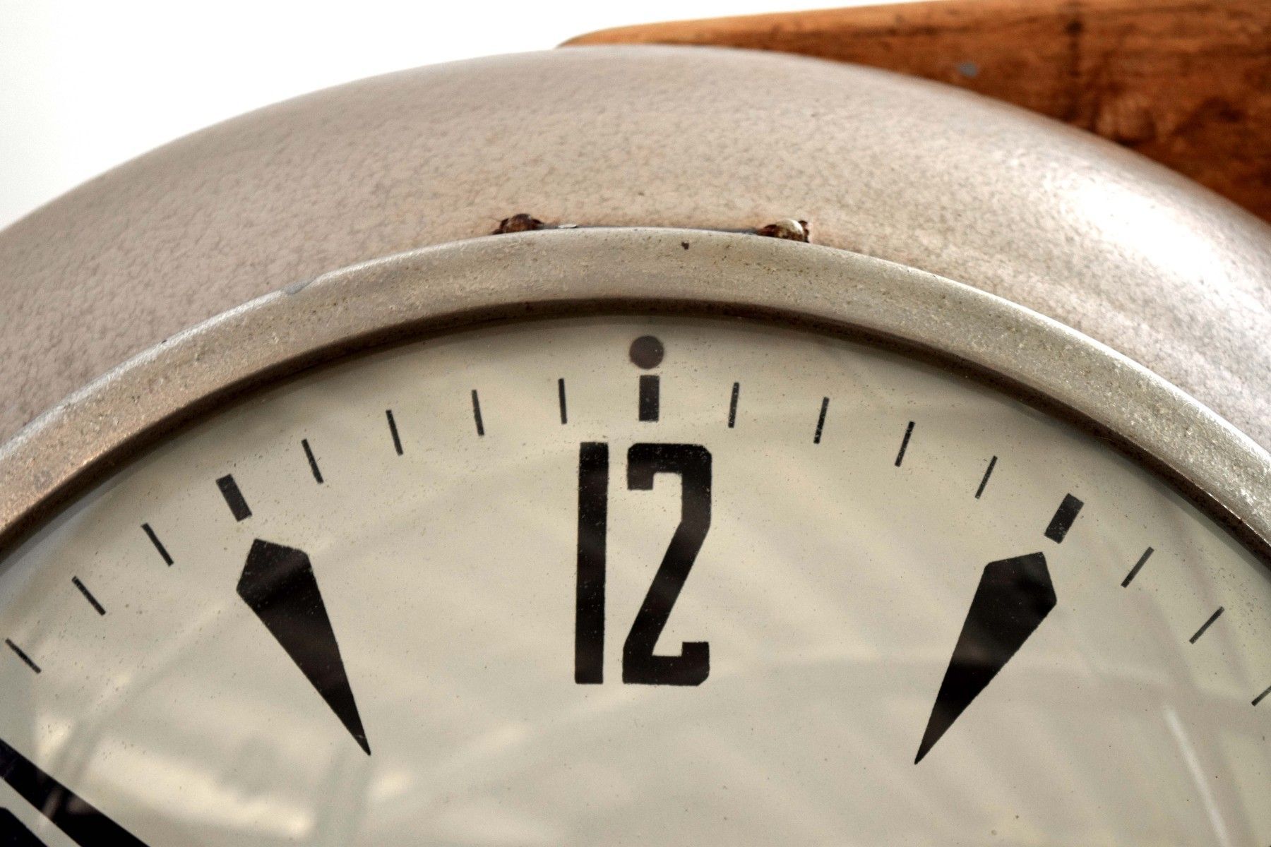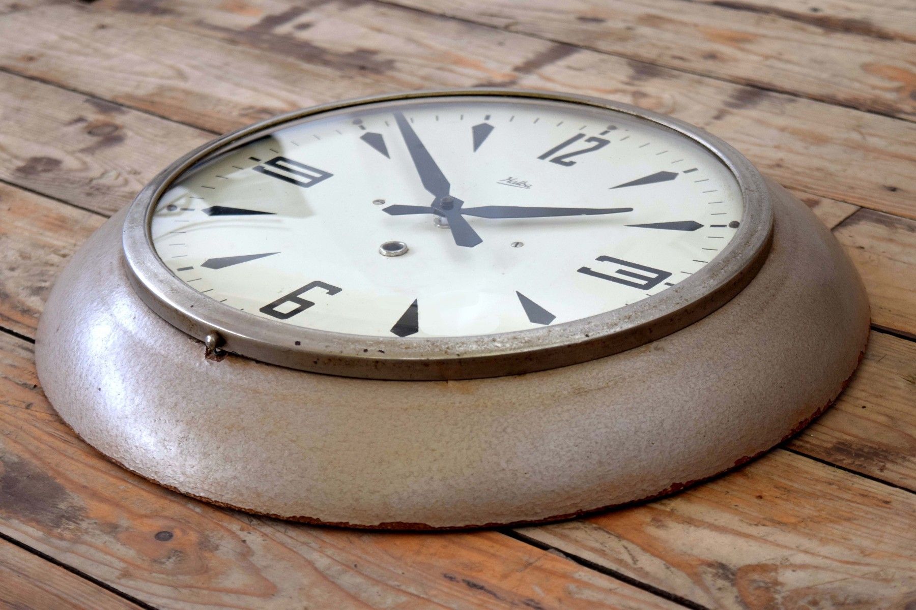 historische Wanduhr (Baujahr 1962) Rahmen aus Bakelit, silberfarbener Farbauftrag in Hammerschlag-Optik schwarze Ziffern, Zeiger aus Metall, Scheibe aus gewöbtem Echtglas mit Gebrauchsspuren, schöner Zustand, wohnfertig, voll funktionsfähig Durchmesser 38,5cm, Tiefe 8cm Quarz-Uhrwerk für haushaltsübliche AA-Batterien