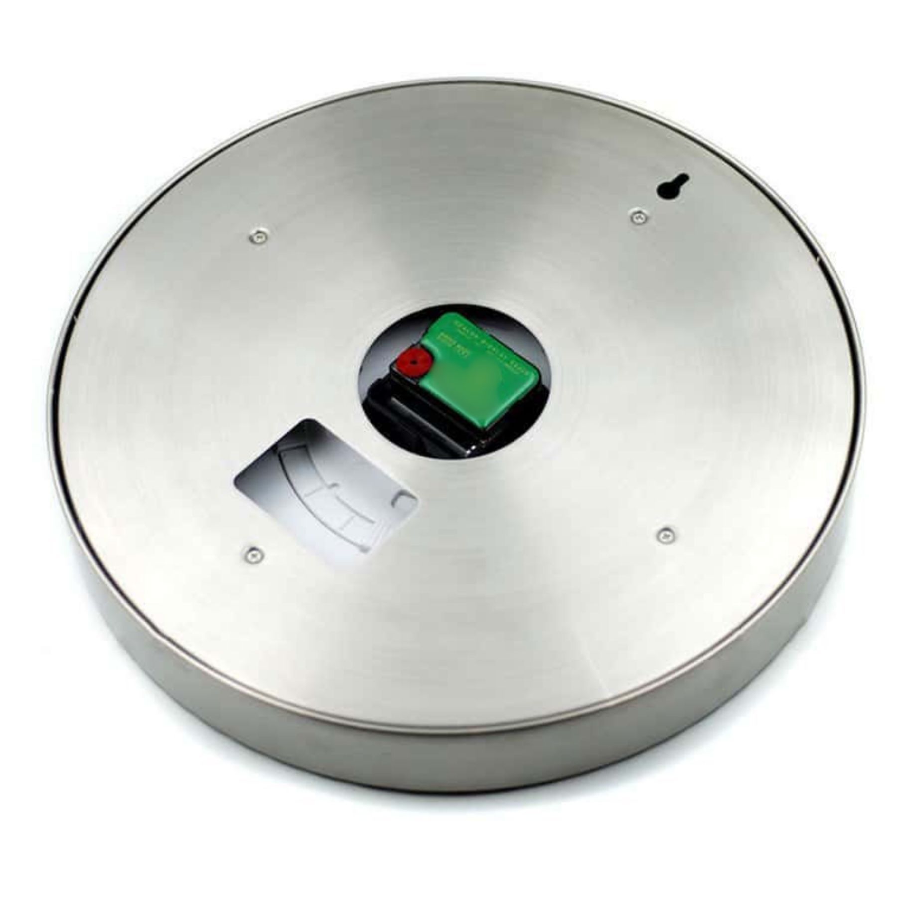 Produktdetails: Zustand: Neu & originalverpackt Durchmesser: 34 cm Material Gehäuse: Gebürsteter Edelstahl Abdeckung: Bruchsicheres Plexiglas Uhrwerk: Präzises Quarzwerk besondersleise & geräuscharm Stromversorgung: 1x AA-Batterie erforderlich (nicht im Lieferumfang enthalten) Aufhäungung: I