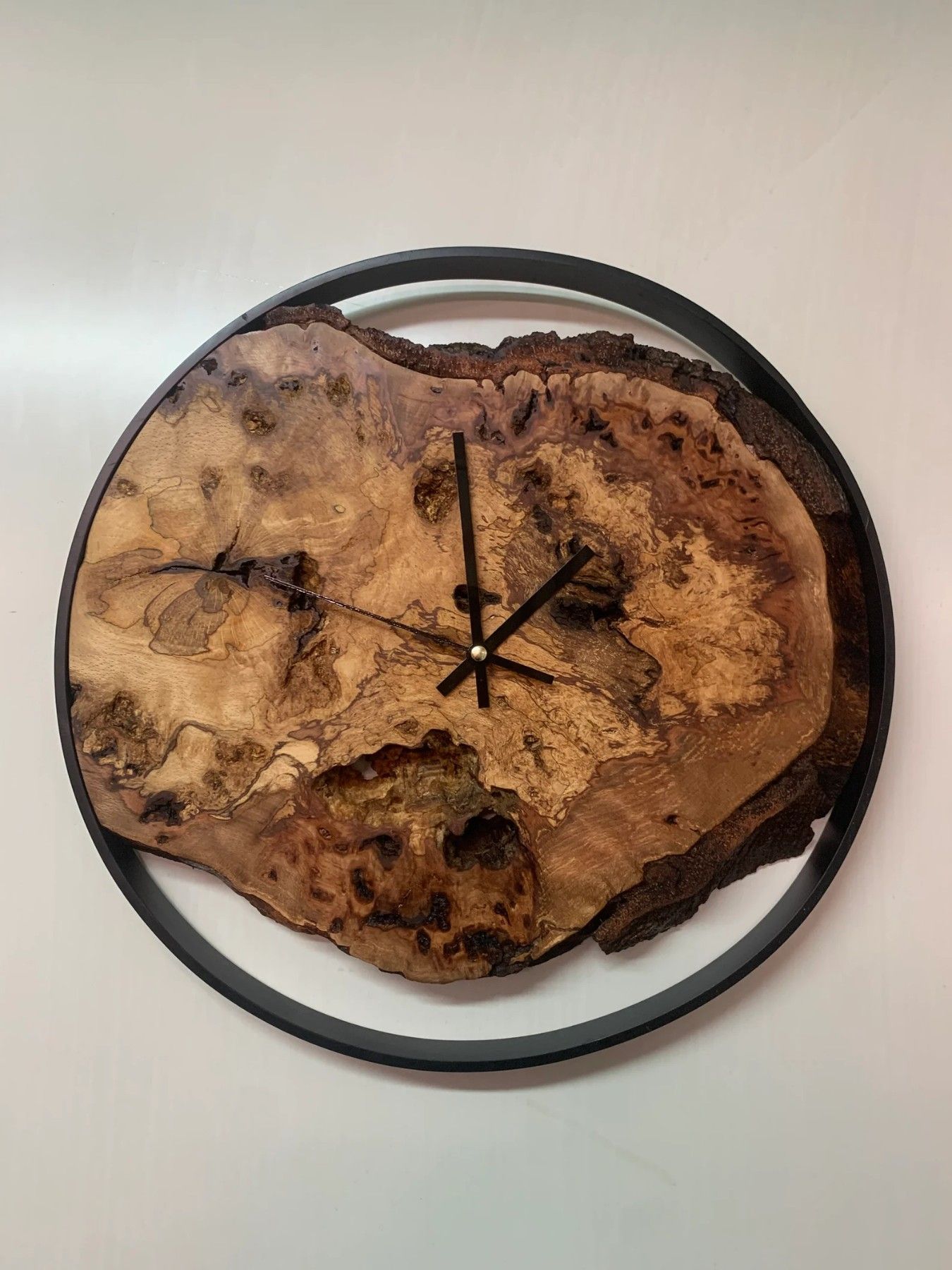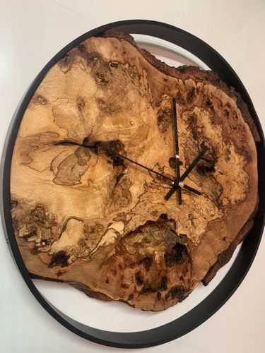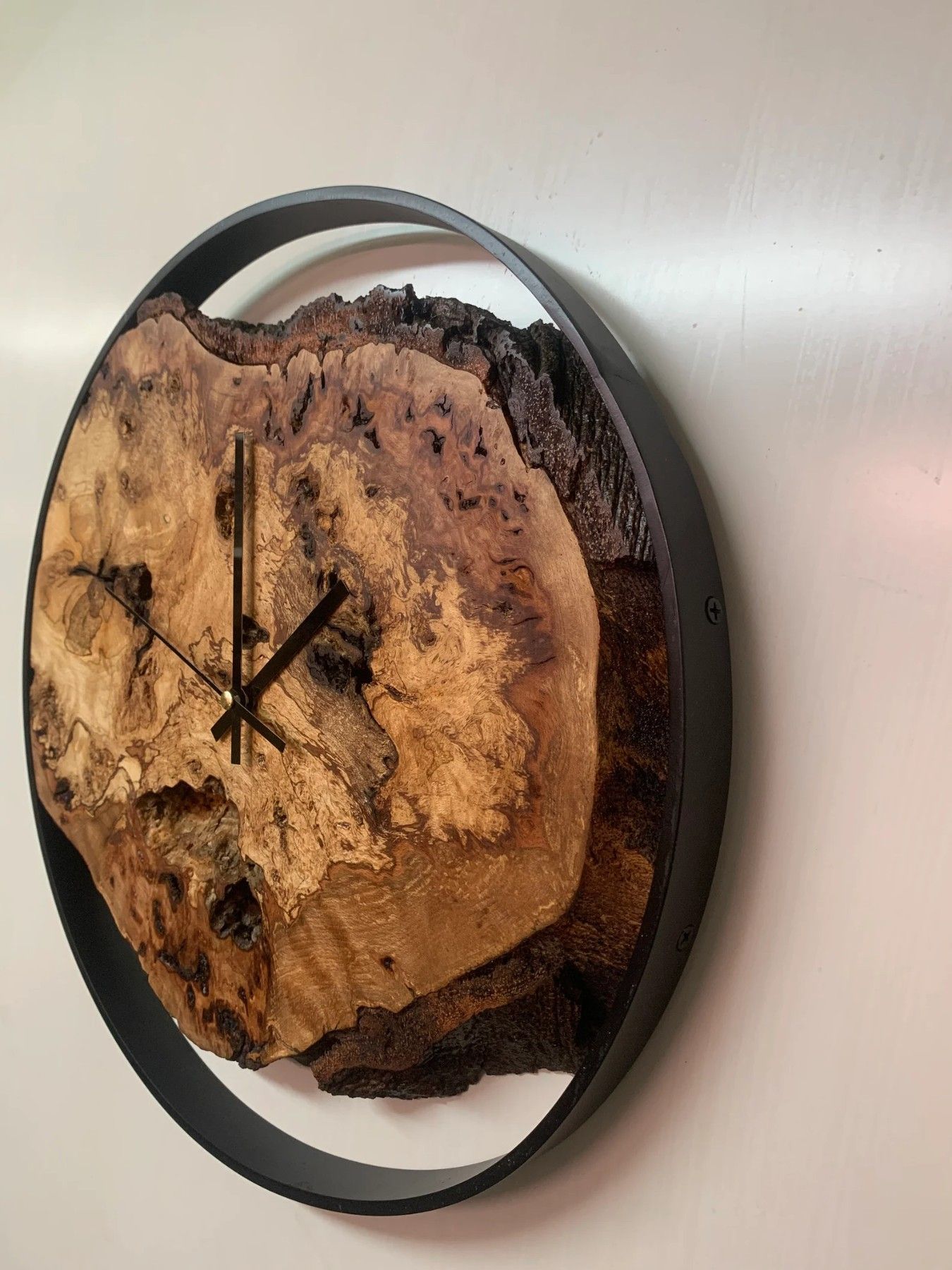 Handgefertigte Wanduhr aus massiver Buche mit einen eleganten Edelstahlring schwarz lackiert. 37cm Durchmesser 2,5cm Dick