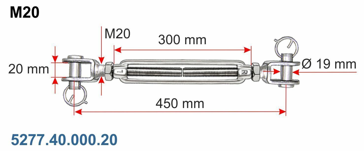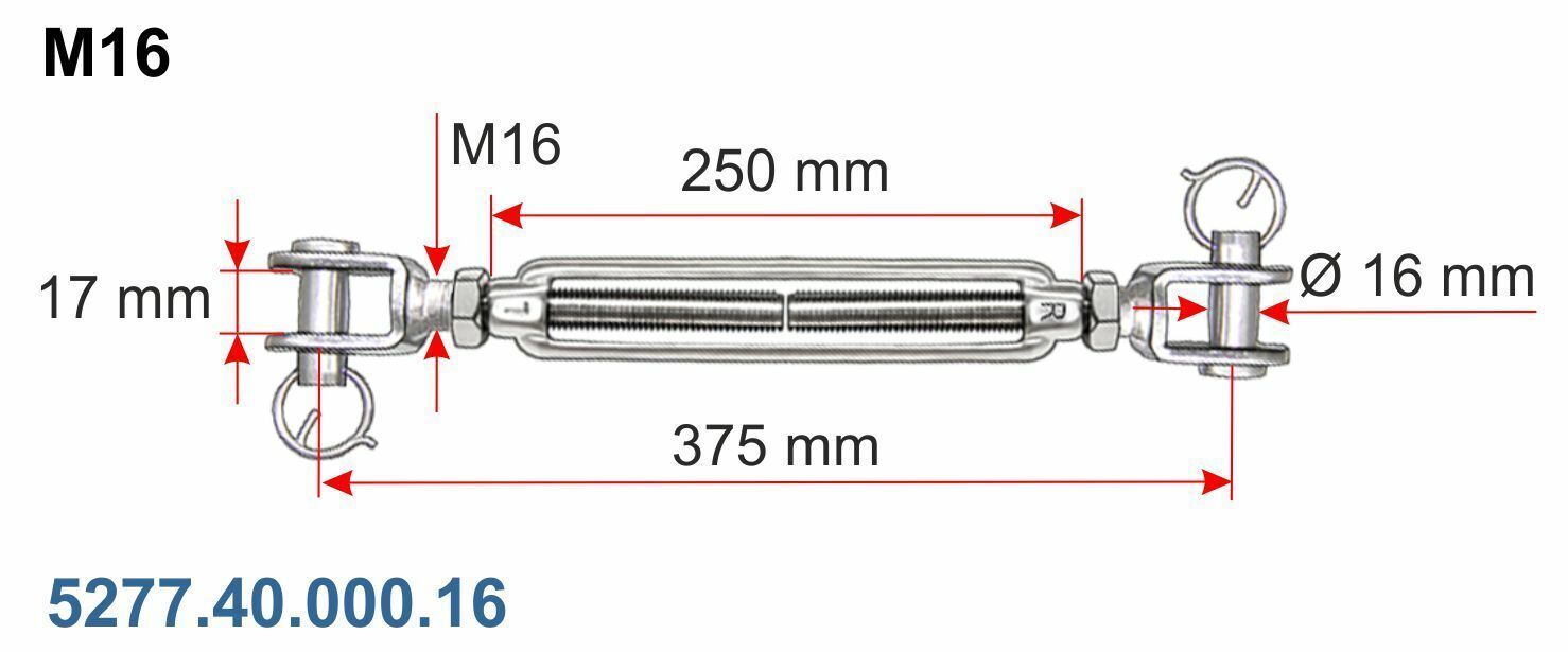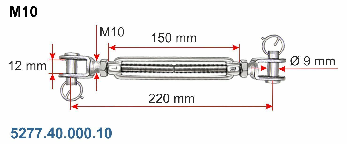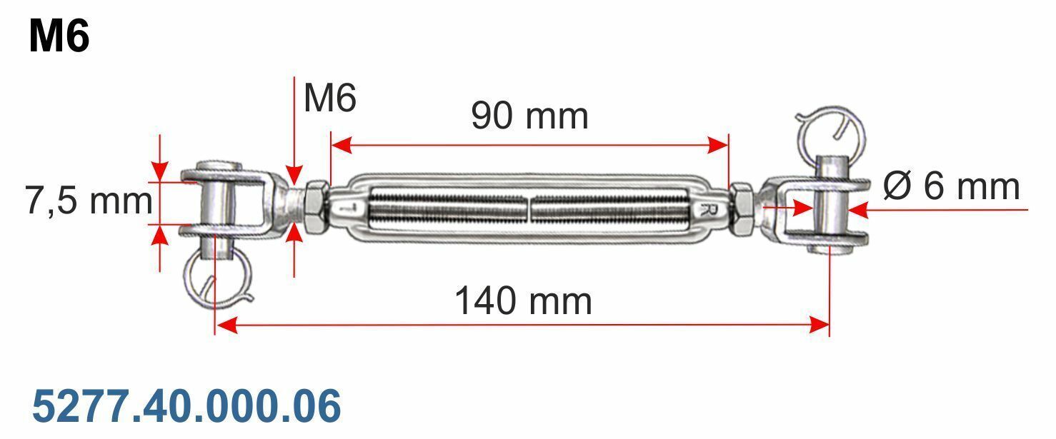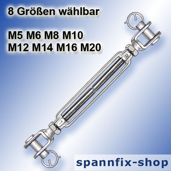 Artikel: Wantenspanner Ausführung: Gabel - Gabel offene Form glänzend poliert rostfrei Material: V4A Edelstahl stainless steel AISI 316 Größe: M5 M6 M8 M10 M12 M14 M16 M20 Artikel-Nr.: Größe: Preis St. 5277.40.000.05 M5 10,45 € 5277.40.000.06 M6 13,08 € 5277.40.000.08 M8 23,49 € 5277.40.000.10 M10 3