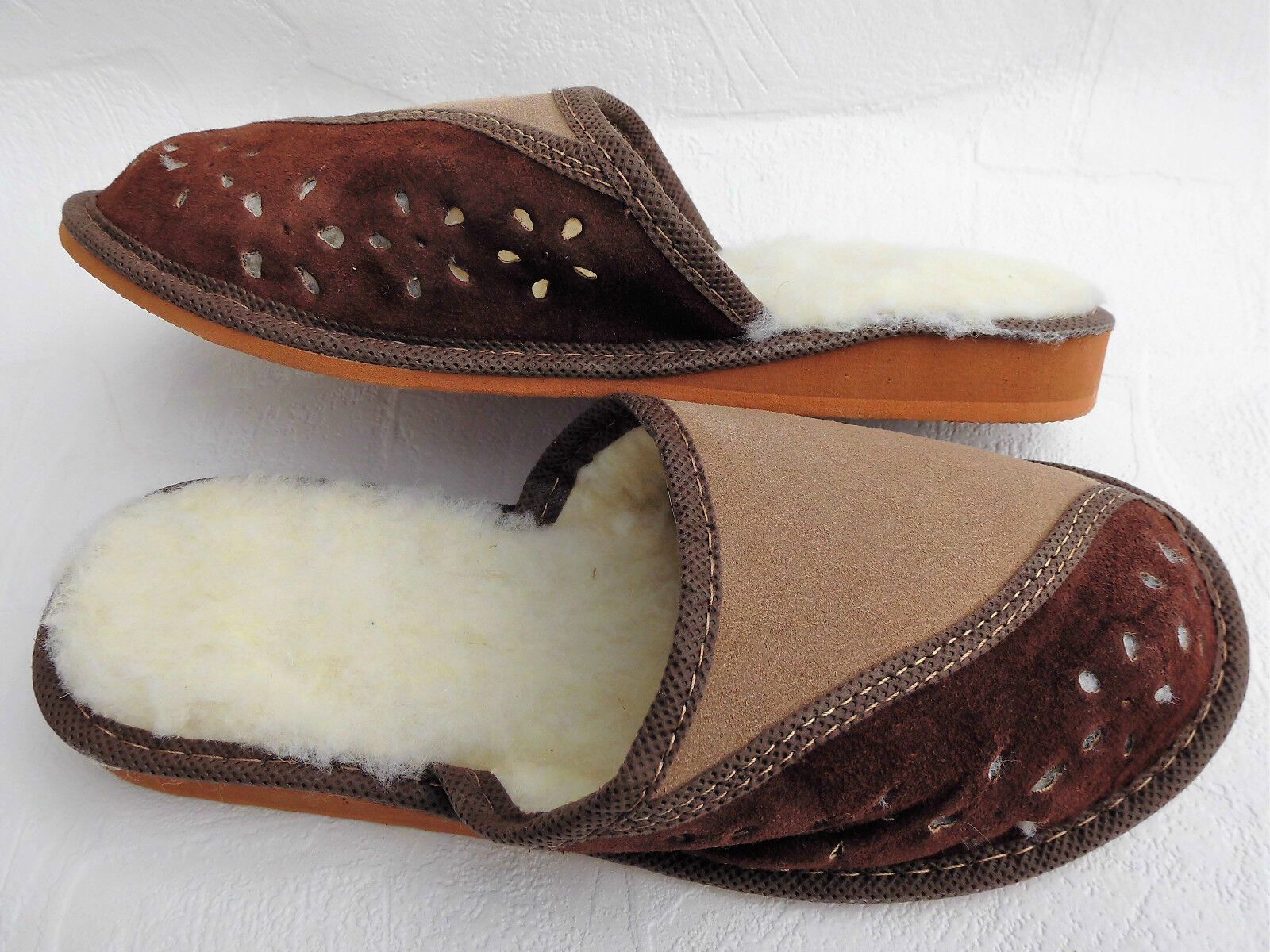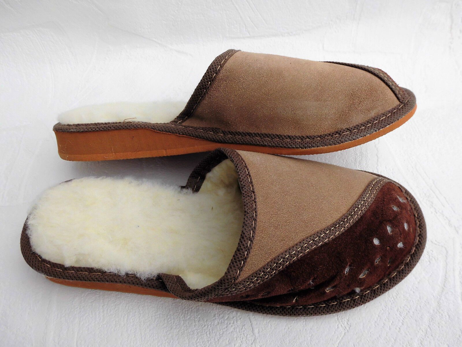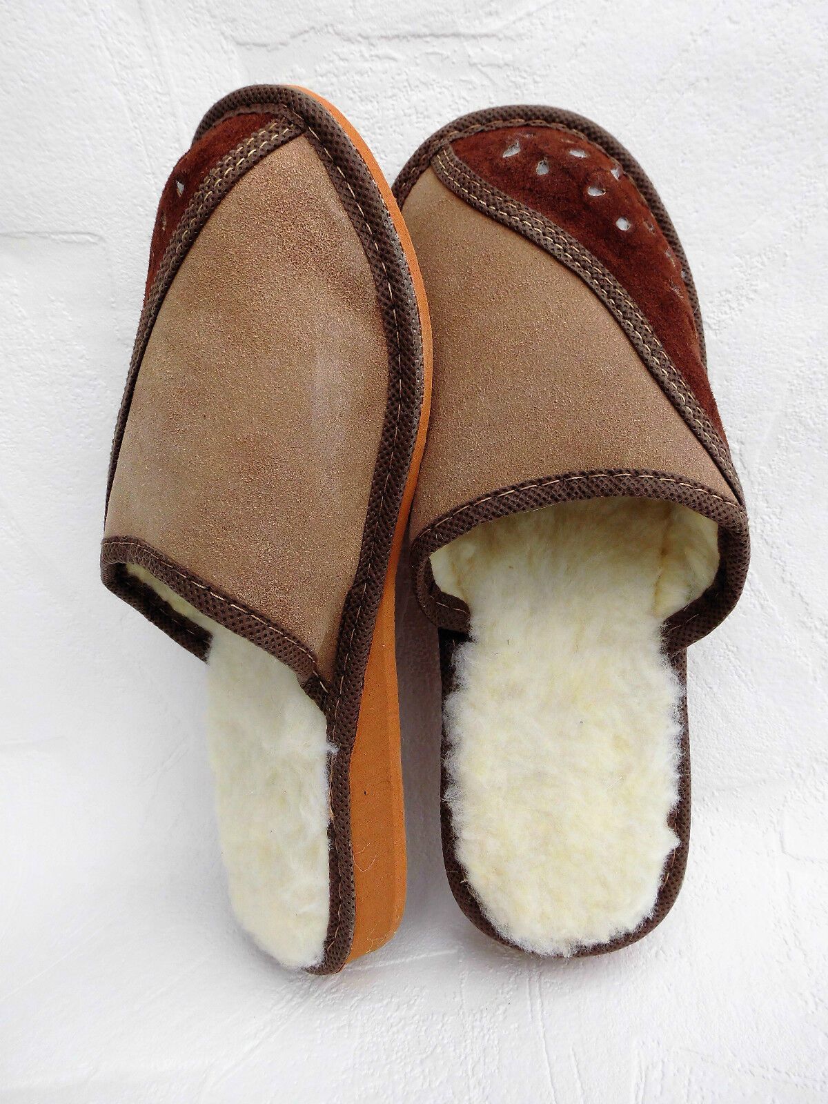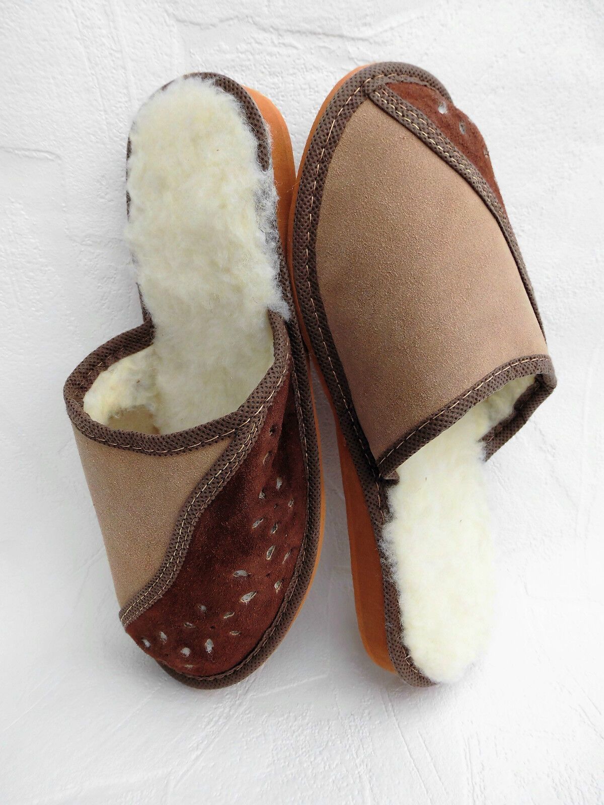 Sehr schöne und bequeme Hausschuhe - Latschen - Pantolette Gr. 41 Die Hausschuhe bestehen außen aus Wild Leder Innen ist der Schuh mit warmer Schurwolle gefüttert Die Sohle besteht aus Gummi (rutschfest) Absatz ca 2,5 cm Sehr leicht und bequem Neu, stabile Ausführung Made in Poland Schauen Sie bitte