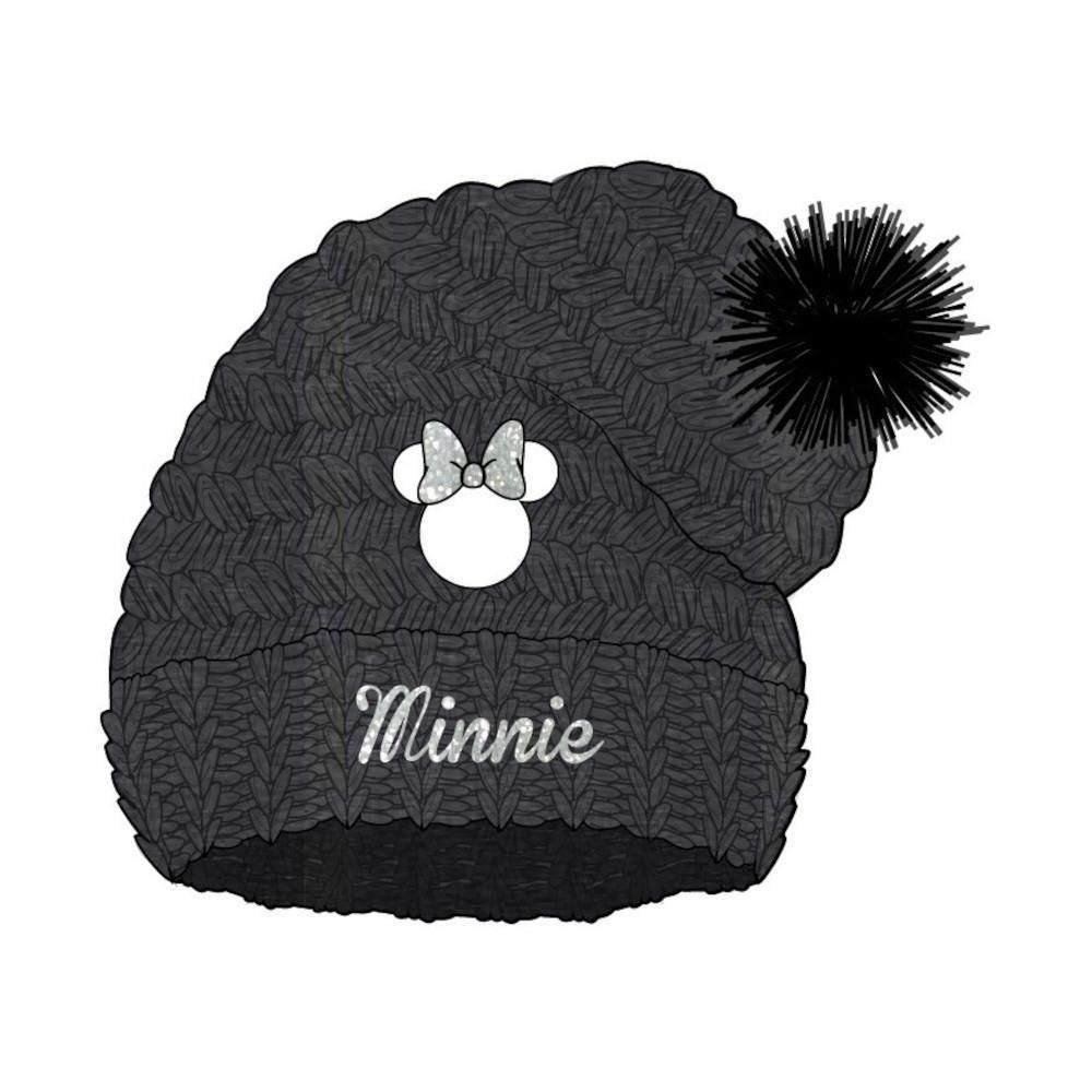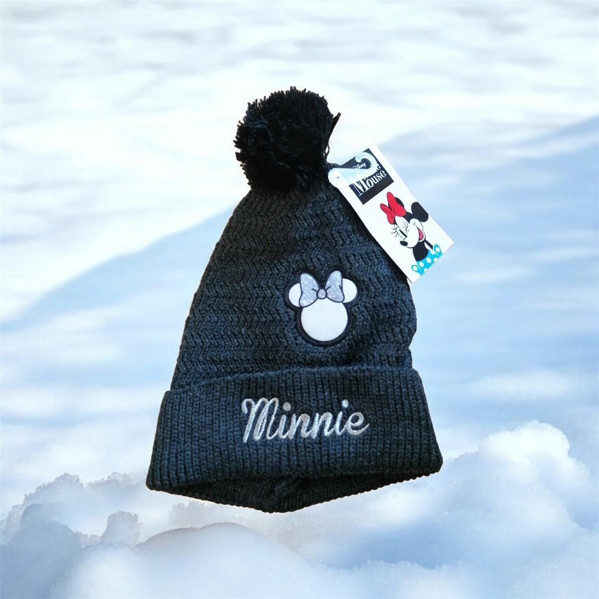 Warme Minnie Mouse Strickmütze mit Bommel / Pompons, Bommelmütze, grau mit Schriftzug