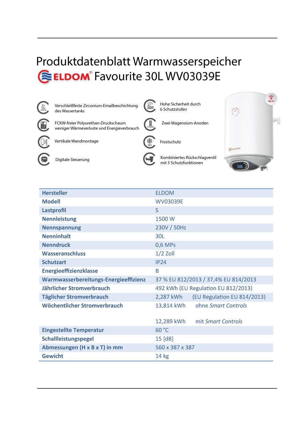 Eldom Warmwasserspeicher Boiler 30L druckfest Eldom Favourite Elektronische Steuerung Wi-Fi