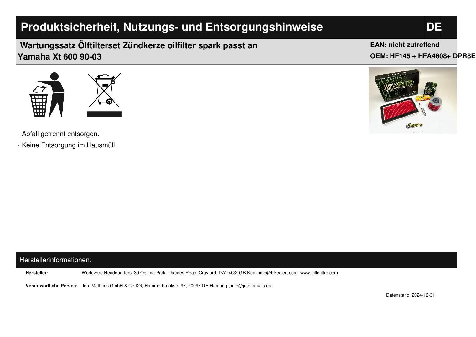 Wartungssatz Ölftilterset Zündkerze oilfilter spark passt an Yamaha Xt 600 90-03 In dieser Auktion gibt es folgenden Artikel zu kaufen: Wartungskit (siehe Foto) Modell: passend für Yamaha XT 600 Bj.: 1990 - 2003 Xtz 660 Tenere H 3YF 4 MD Bj.: 1990 - 1995 Lieferumfang: 1 x Ölfilter Hiflo HF145 1 x Lu