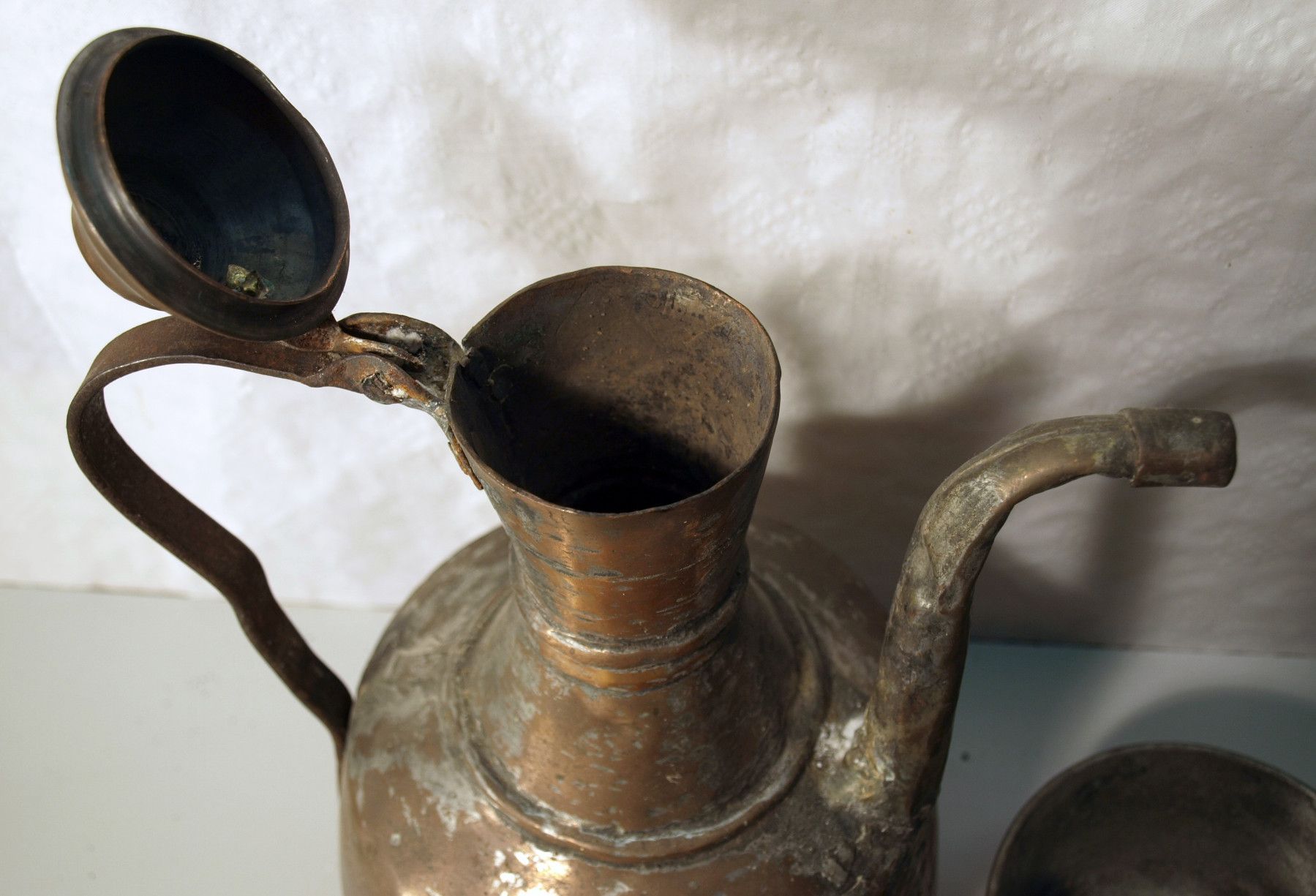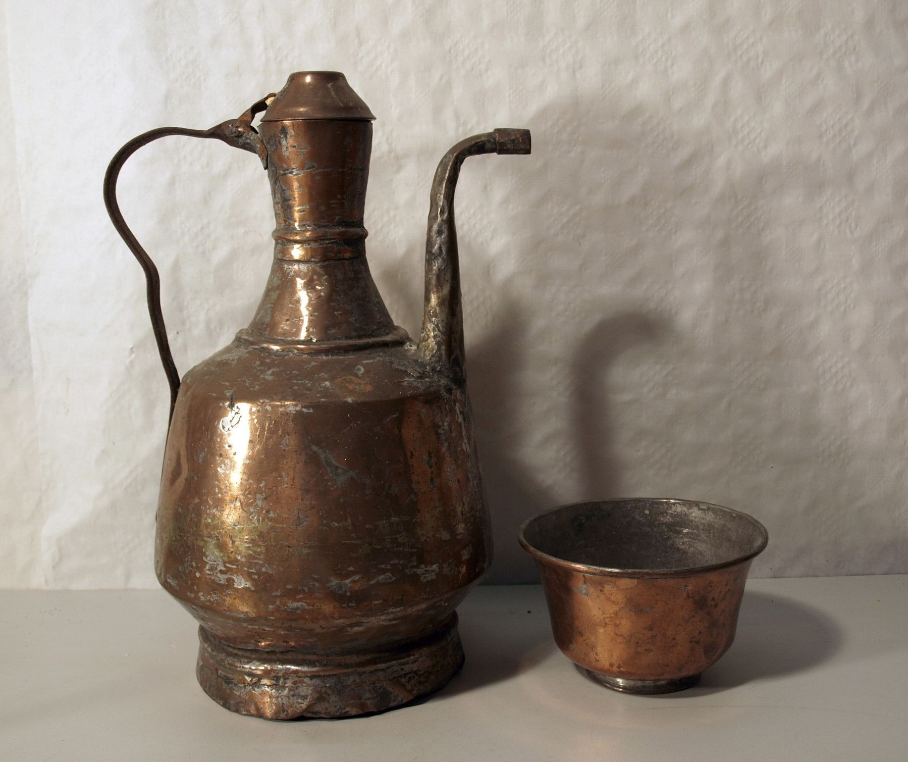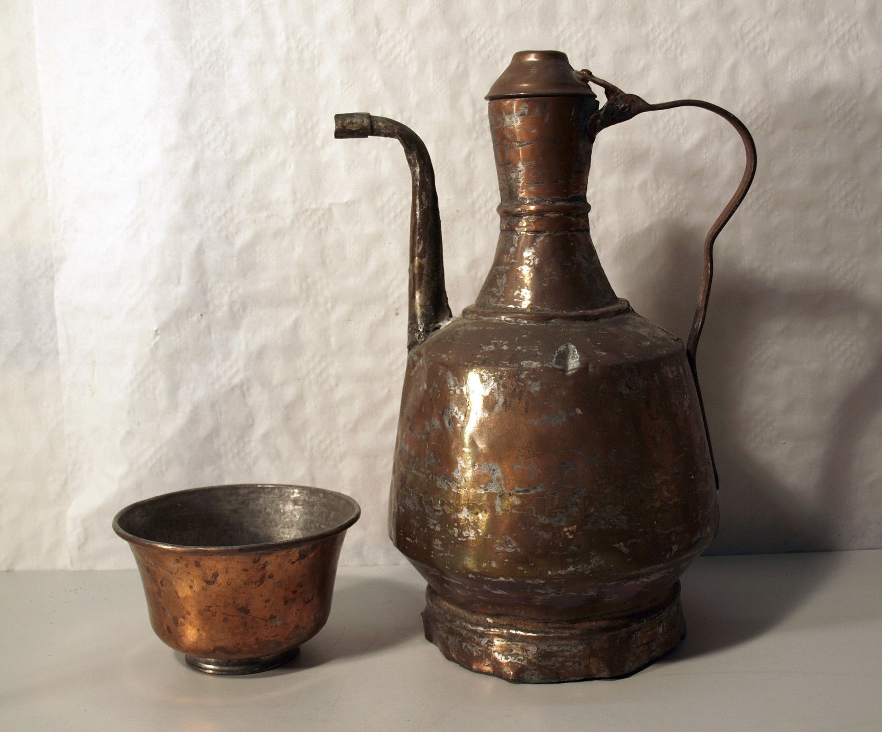 Waschset um 1910. Bestehend aus Wasserkanne und passender -schale. Gekauft 1962 in Marokko. Ohne Marke: siehe Foto. Die Kanne ist schon mehrfach repariert worden. Maße: Kanne H 36 cm. Antikes am Deich - Inh: Oliver Kipp-Trense