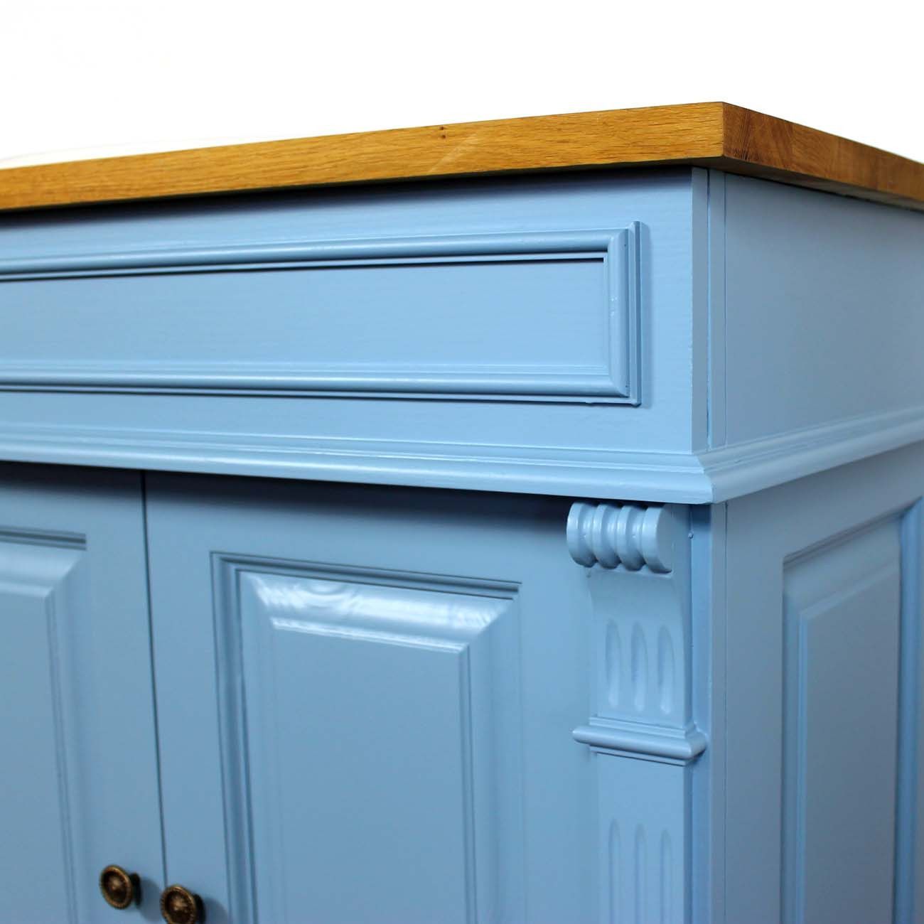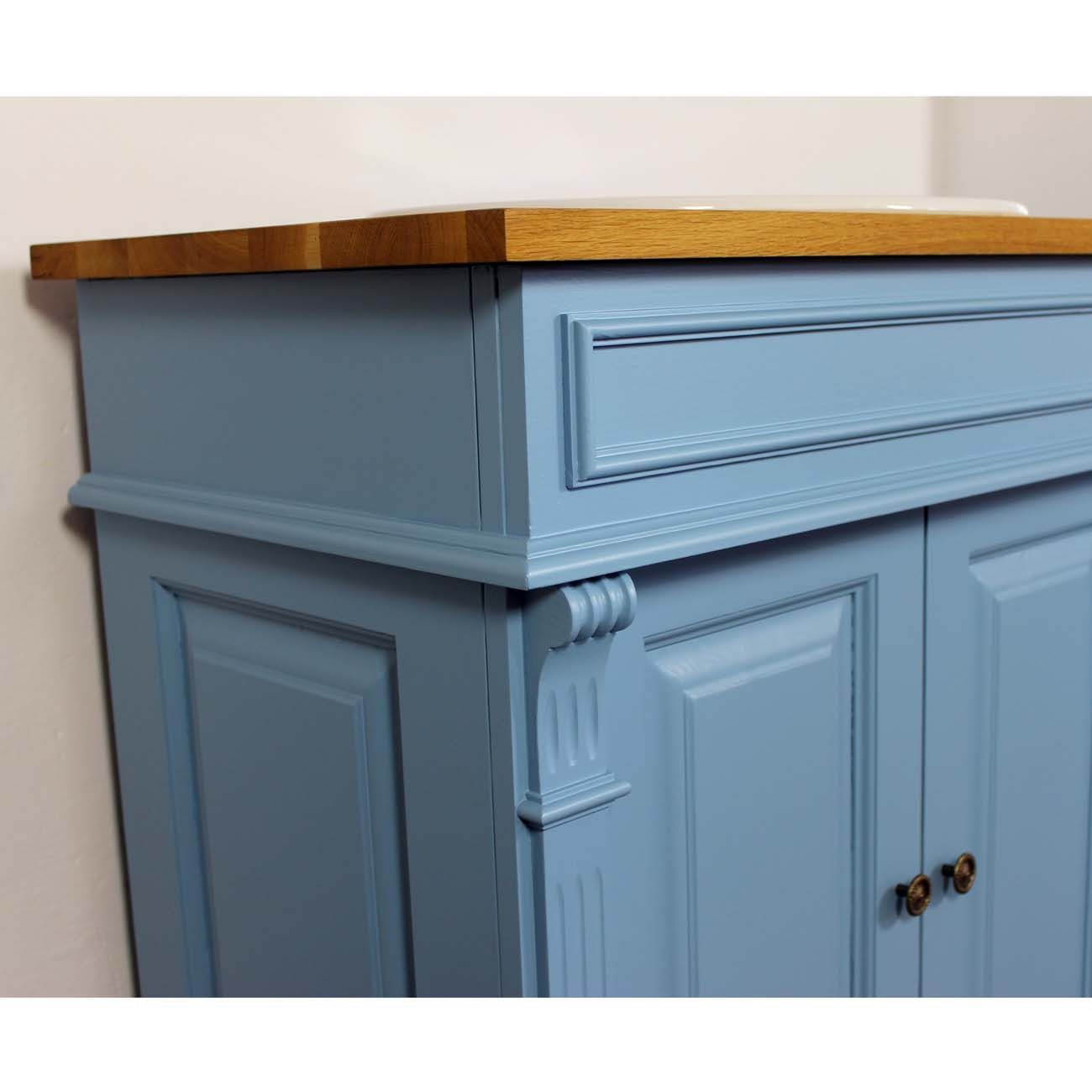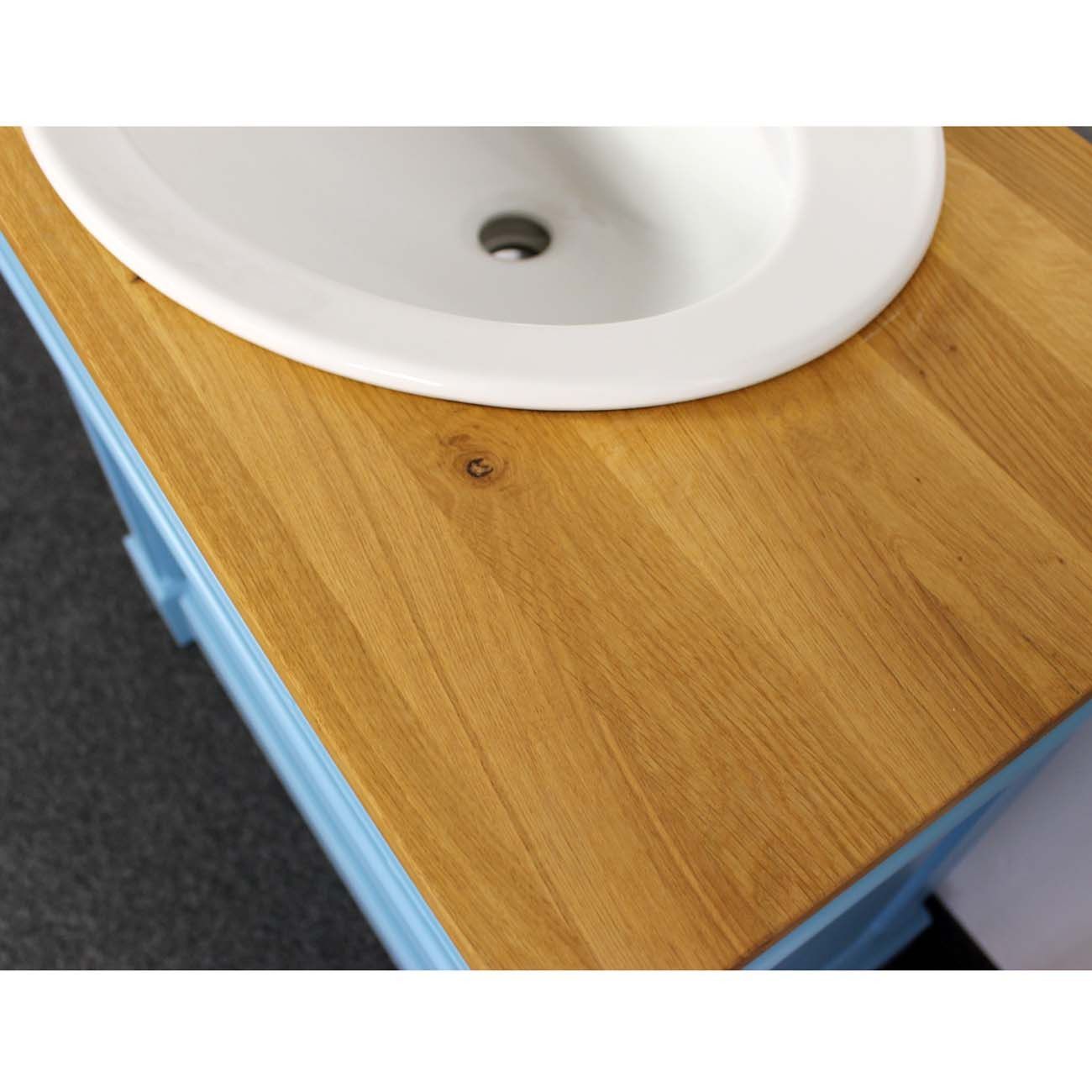 Der Massivholz Waschtisch wurde in himmelblau lackiert und mit einer Eichenplatte ausgestattet. Maße: Höhe: 91cm, Breite: 90cm, Tiefe: 51cm Farbe Korpus: P053 himmelblau lackiert Eichenplatte: P061 Acryl Natur lackiert