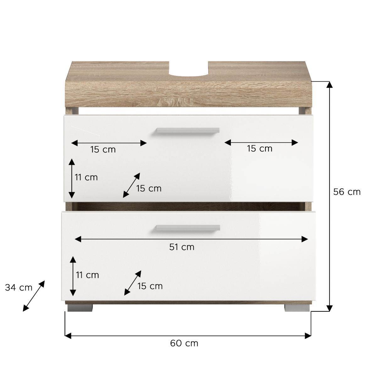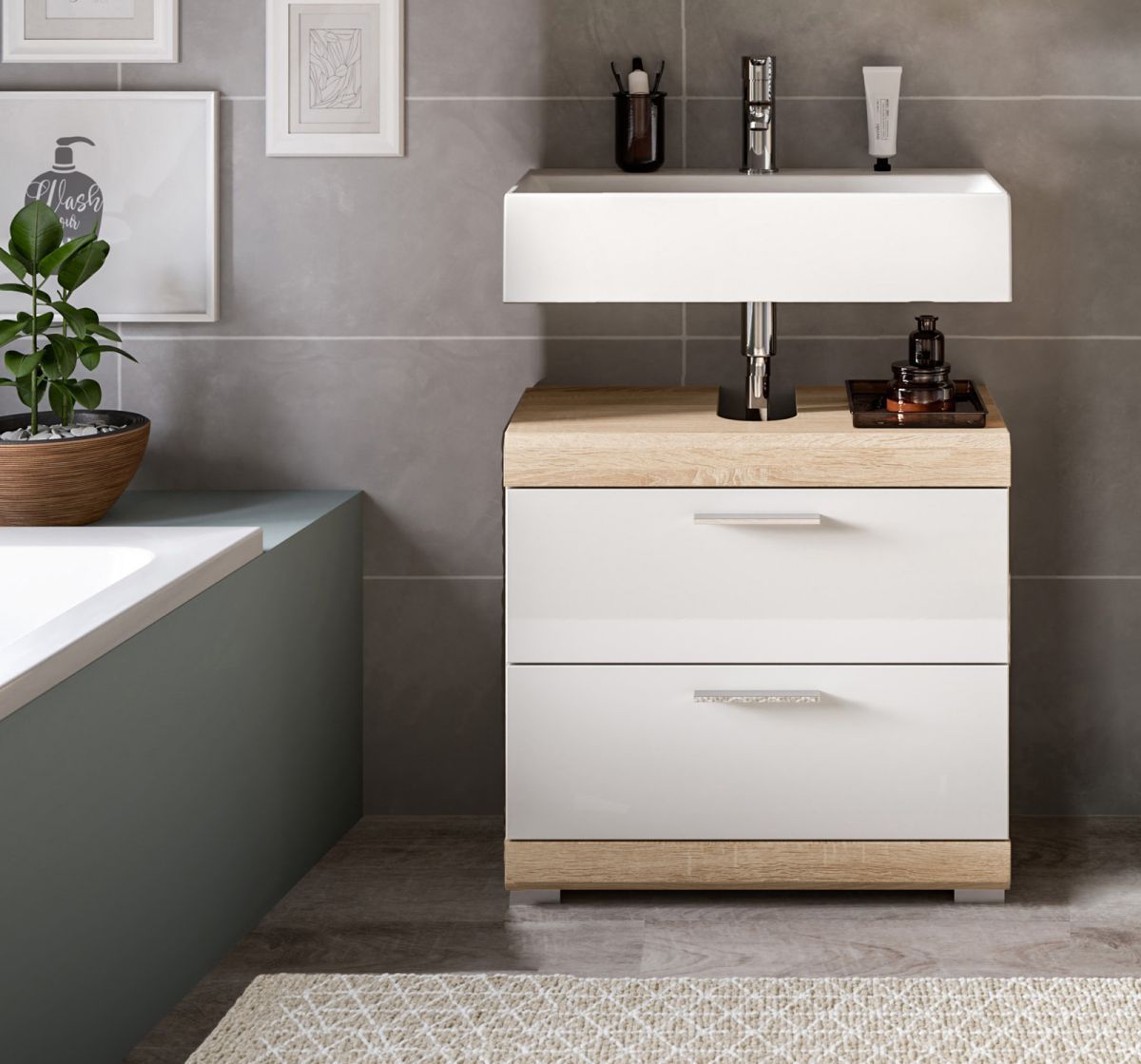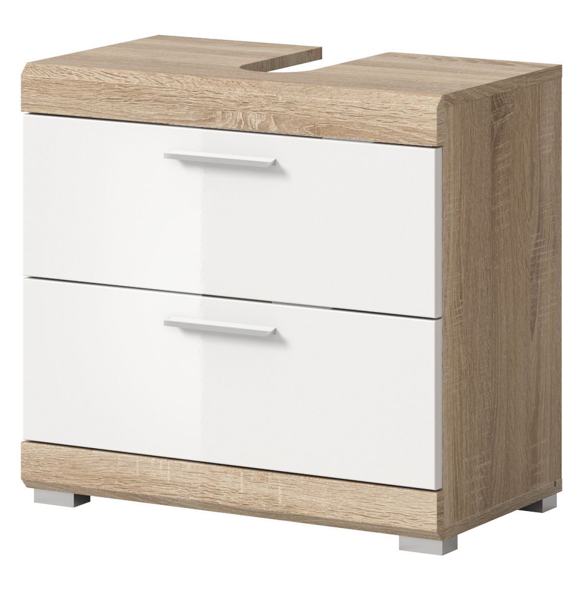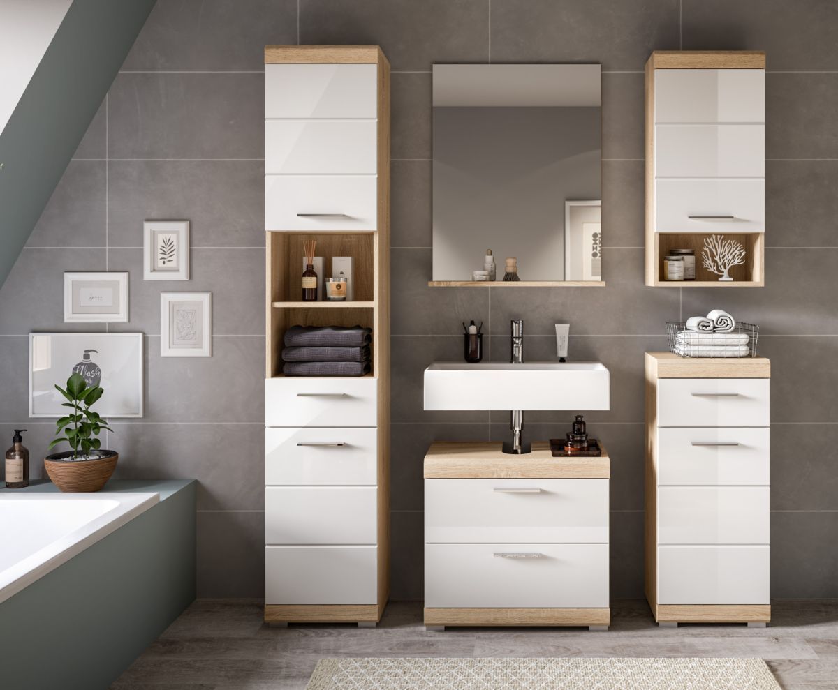 Waschbeckenunterschrank weiß Hochglanz Eiche Sonoma Bad Unterschrank Mambo 60 cm