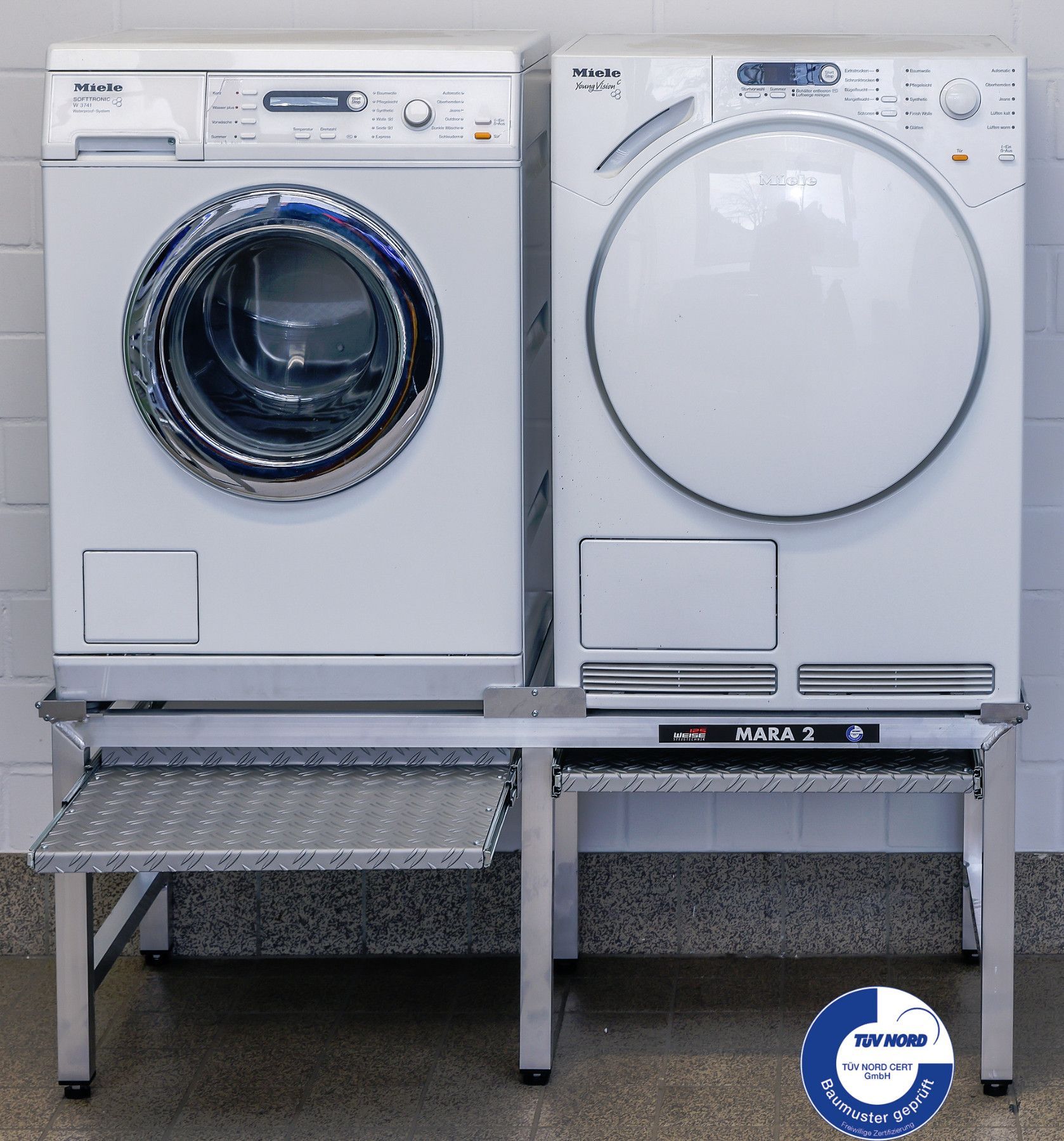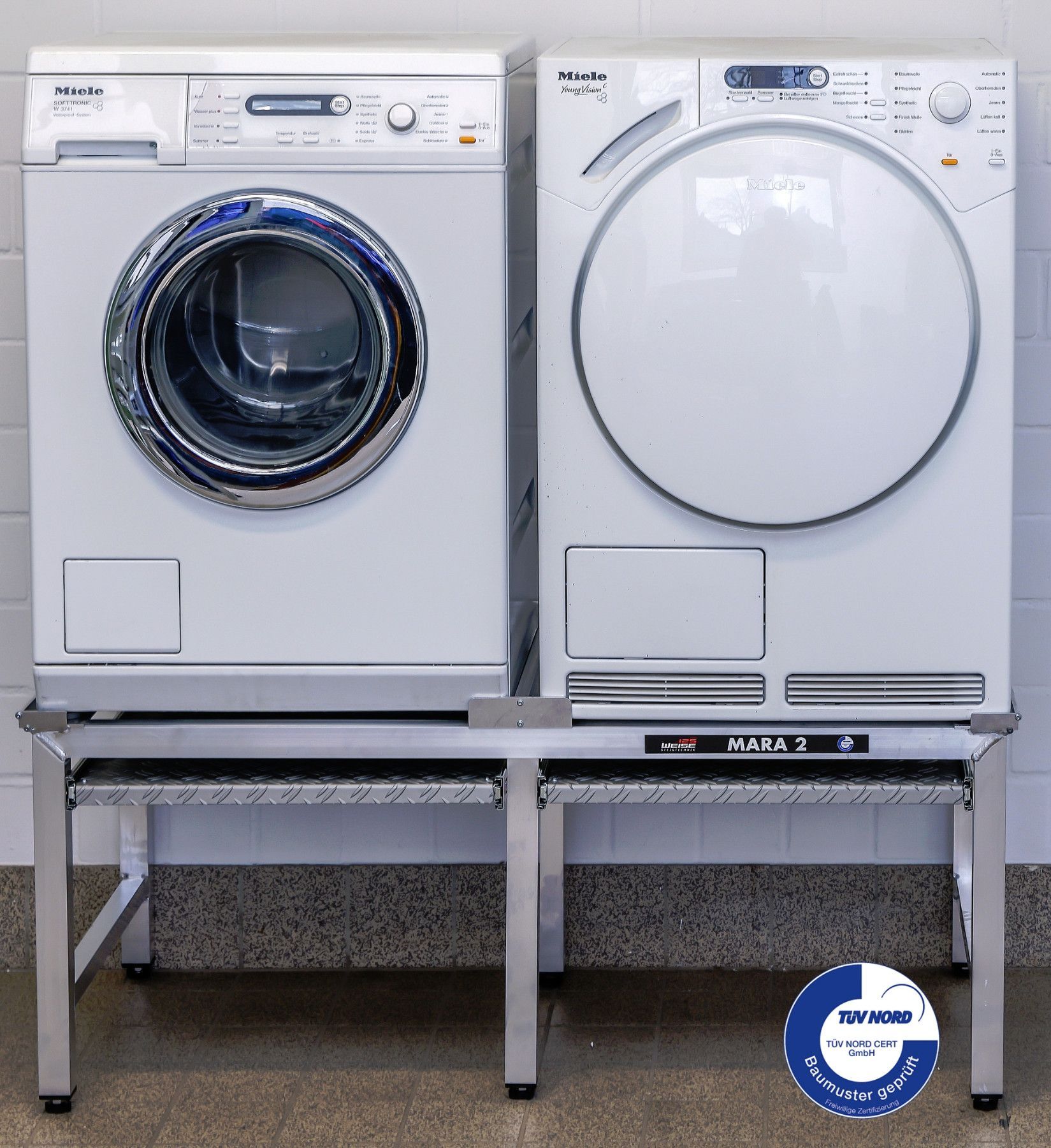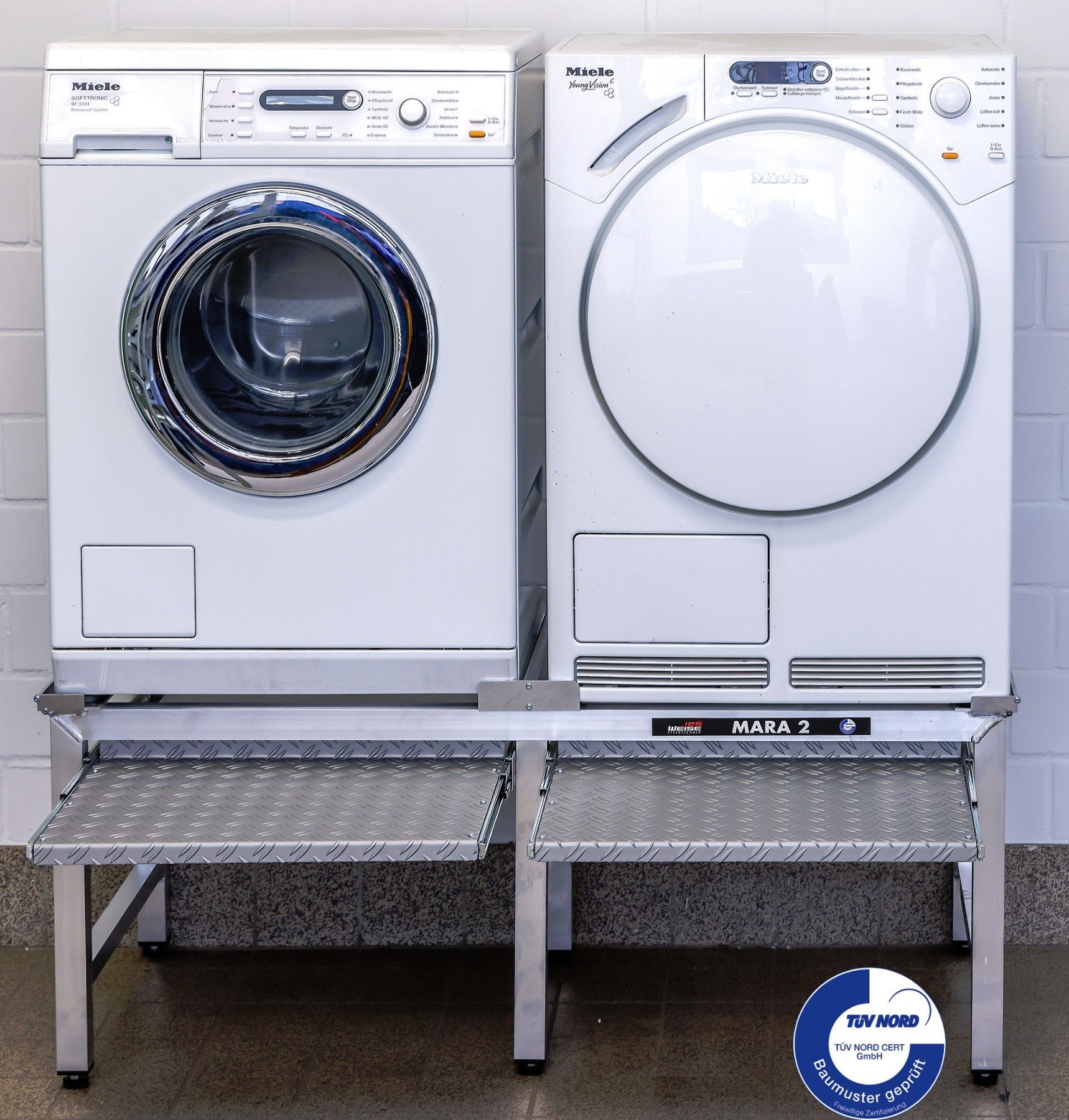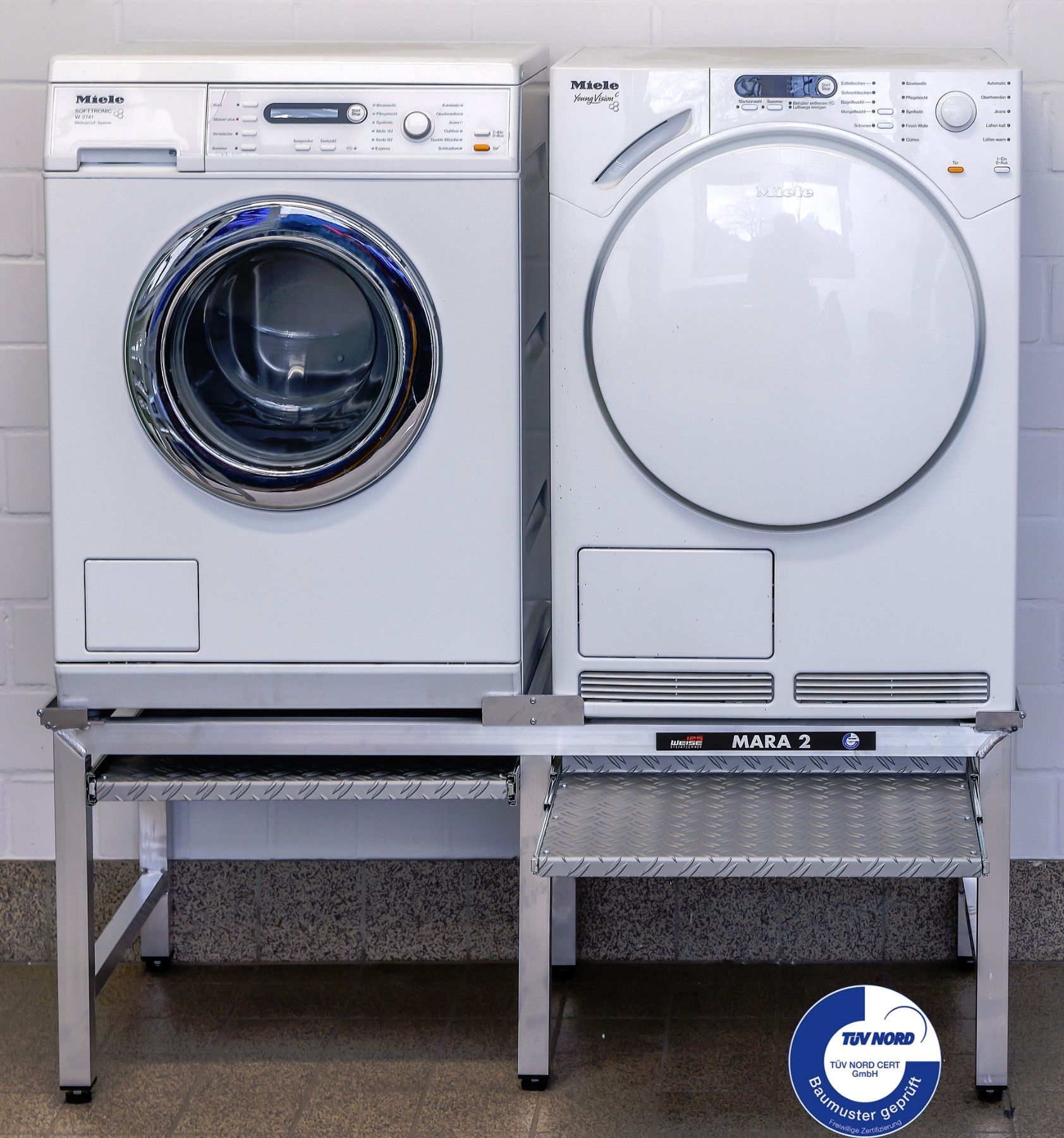 Wir haben uns für die 50-cm-hohe-Variante entschieden, da diese für uns bei einer Körpergrösse von 165 - 185 cm die beste Arbeitshöhe ist. Außerdem passt unter das Auszugsblech ein normaler Eimer oder auch ein Wäschekorb. Beim Anheben und Einsetzen der Waschmaschine - diese wiegt 97 kg - haben wir darauf geachtet, dass die vorderen Alluminium-Begrenzer nicht belastet wurden, auch wenn diese von unten verschweisst und von vorne verschraubt sind. Damit das gelingt haben wir uns etwas einfallen gelassen: 1. Wir haben uns zwei Kanthölzer - 700 mm lang , 50 x 50 mm - zurecht geschnitten. 2. Je ein Kantholz parallel neben die Alluminiumschine gelegt [Holzoberkante ist höher als Alu-Begrenzer] 3. Die Waschmaschine haben wir vorne auf die Kanthölzer gesetzt und dann ... 4. Von dort aus nach hinten in die endgültige Position durchgeschoben. 5. Jetzt die Maschine leicht nach links kippen und das rechte Kantholz herausziehen. 6. Danach die Maschine leicht nach rechts kippen und das linke Kantholz herausziehen.