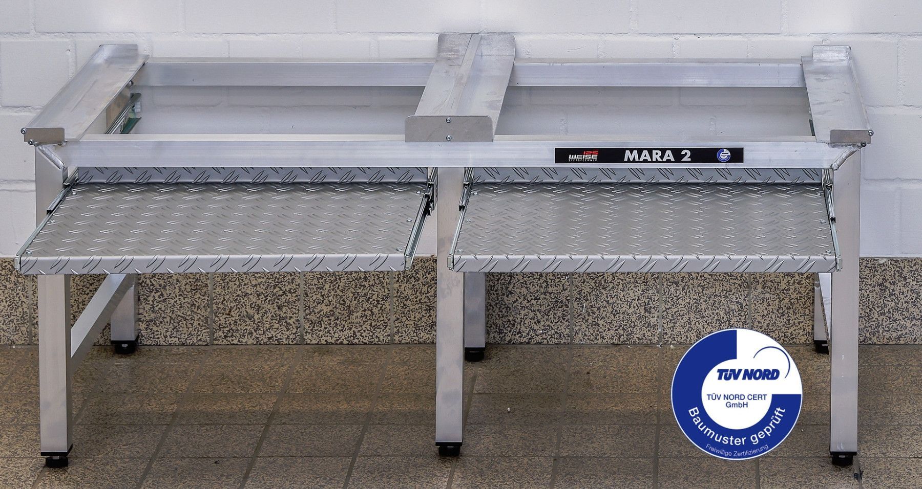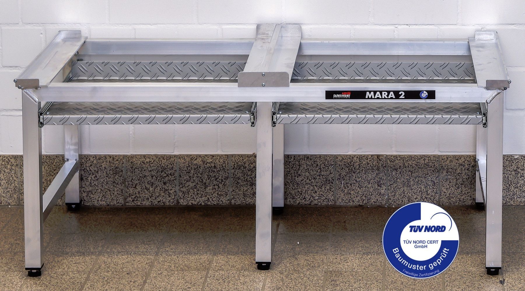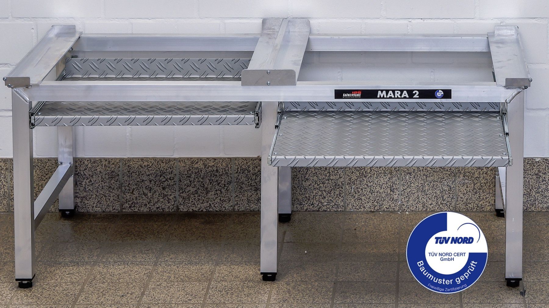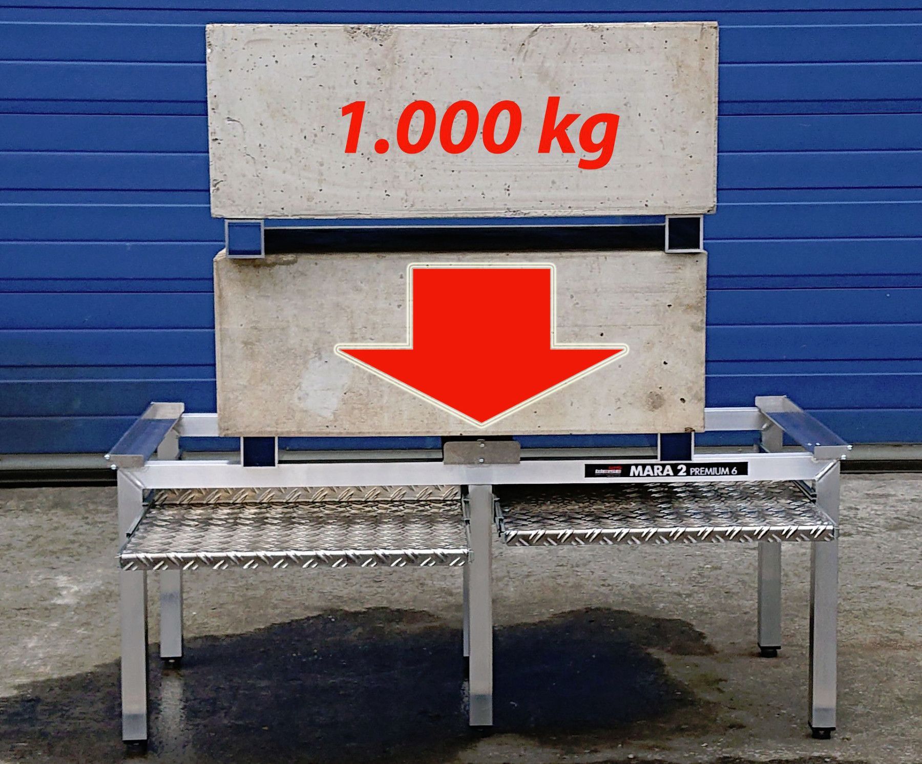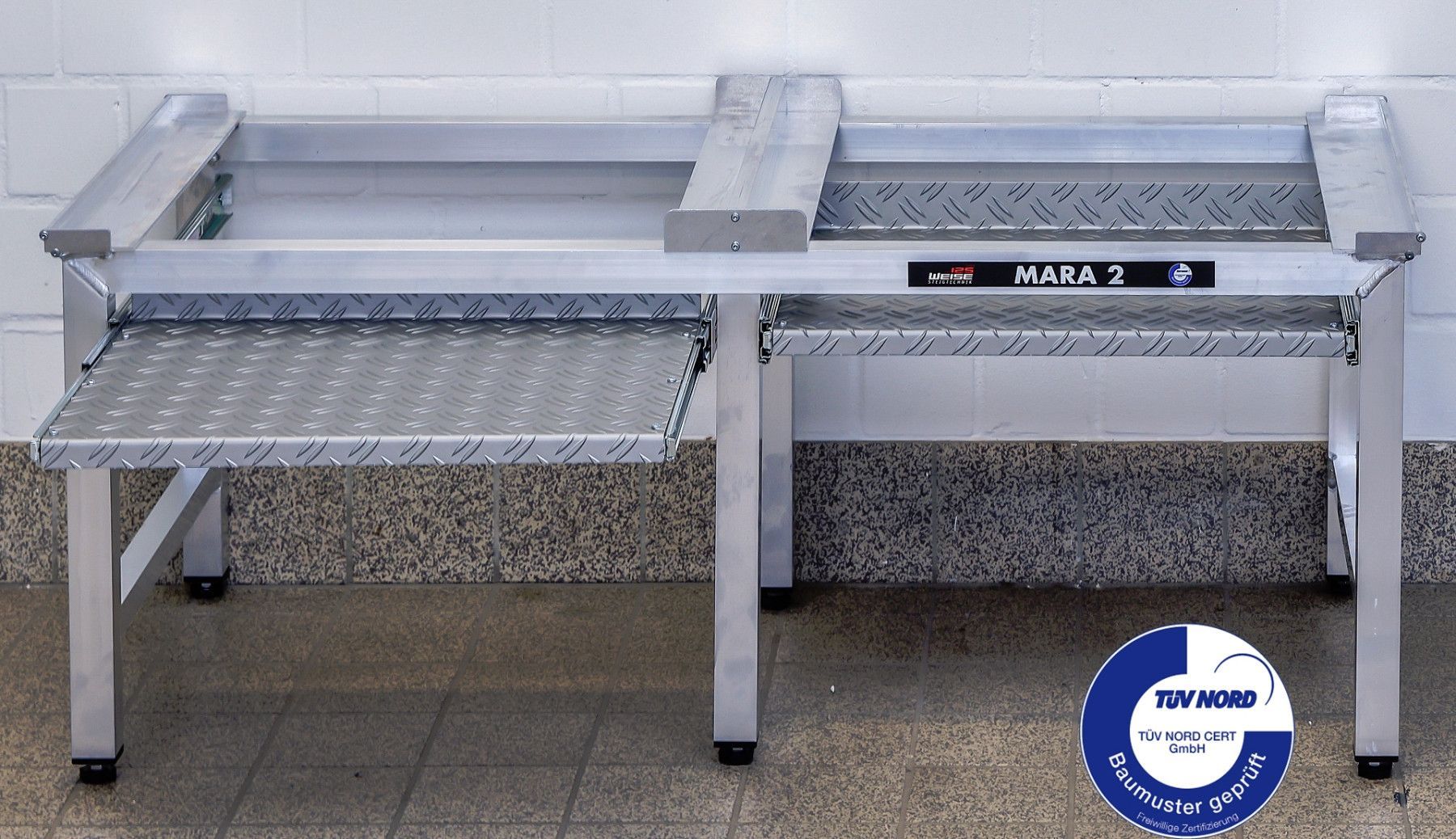 Wir haben uns für die 50-cm-hohe-Variante entschieden, da diese für uns bei einer Körpergrösse von 165 - 185 cm die beste Arbeitshöhe ist. Außerdem passt unter das Auszugsblech ein normaler Eimer oder auch ein Wäschekorb. Beim Anheben und Einsetzen der Waschmaschine - diese wiegt 97 kg - haben wir darauf geachtet, dass die vorderen Alluminium-Begrenzer nicht belastet wurden, auch wenn diese von unten verschweisst und von vorne verschraubt sind. Damit das gelingt haben wir uns etwas einfallen gelassen: 1. Wir haben uns zwei Kanthölzer - 700 mm lang , 50 x 50 mm - zurecht geschnitten. 2. Je ein Kantholz parallel neben die Alluminiumschine gelegt [Holzoberkante ist höher als Alu-Begrenzer] 3. Die Waschmaschine haben wir vorne auf die Kanthölzer gesetzt und dann ... 4. Von dort aus nach hinten in die endgültige Position durchgeschoben. 5. Jetzt die Maschine leicht nach links kippen und das rechte Kantholz herausziehen. 6. Danach die Maschine leicht nach rechts kippen und das linke Kantholz herausziehen.
