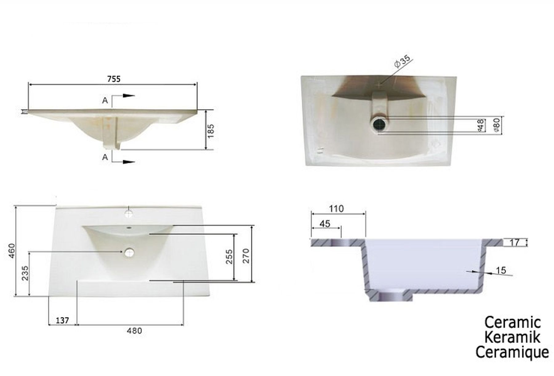 Waschplatz 75,5cm, Waschtisch Artemis, Unterschrank, Keramikbecken