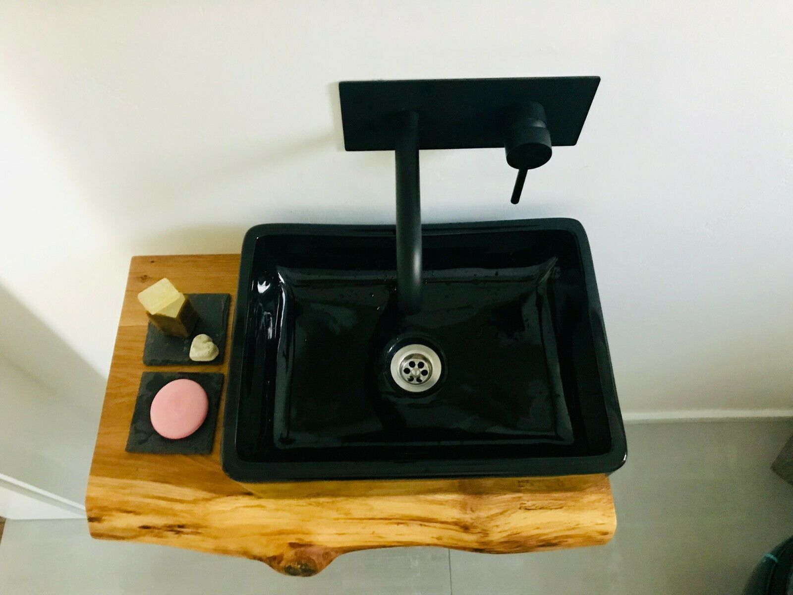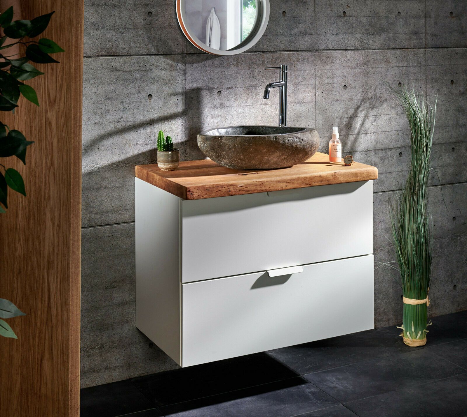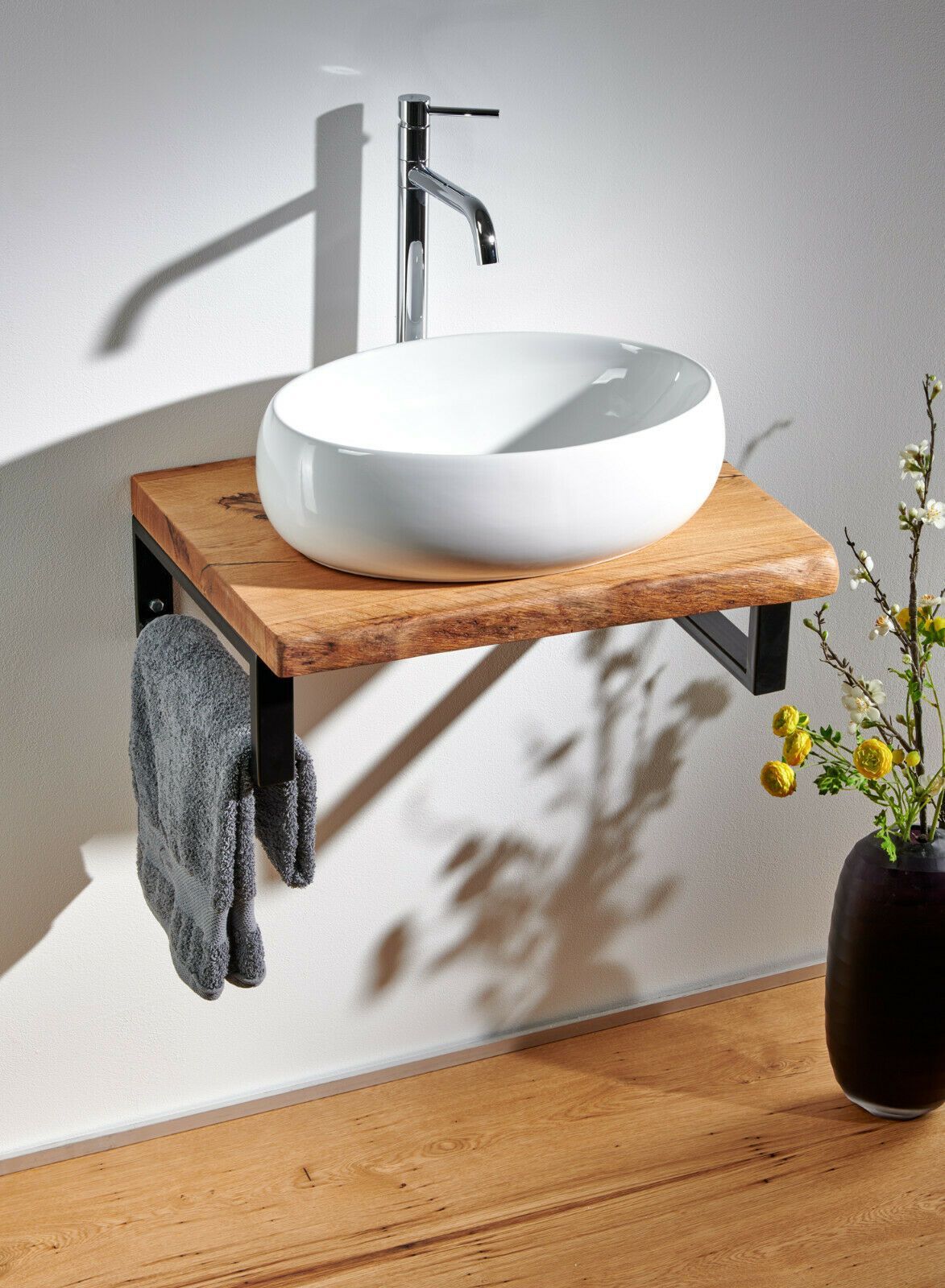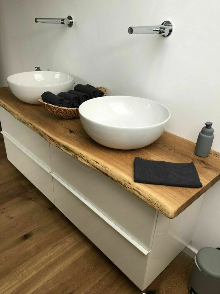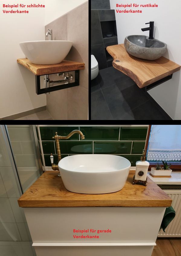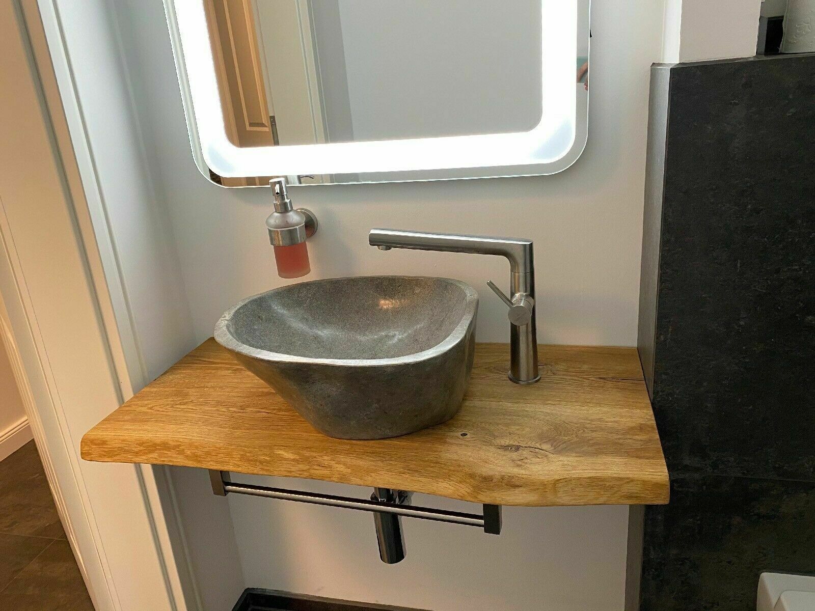 Waschtisch Eiche Holzplatte massiv Holz Aufsatzbecken Naturkante Zuschnitt geölt