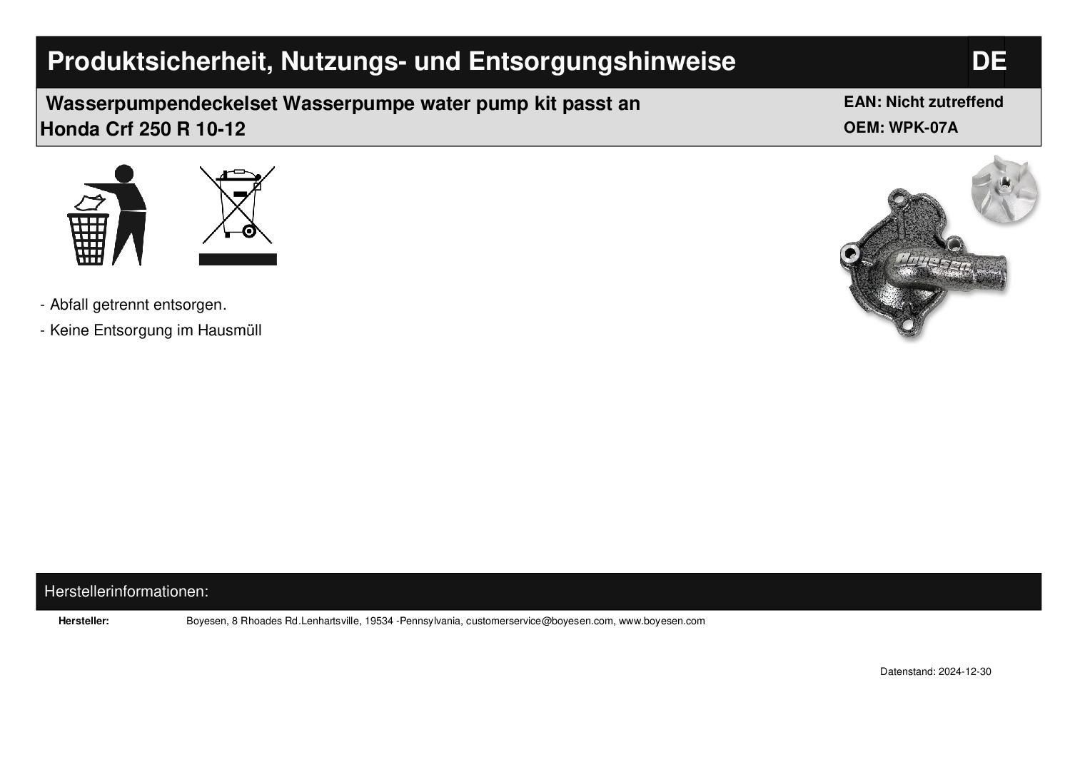 Wasserpumpendeckelset Wasserpumpe water pump kit passt an Honda Crf 250 R 10-12