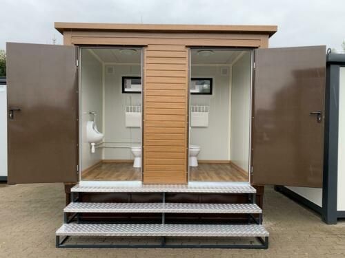 einfach anschließen- sofort einsatzbereit WC Doppelkabine mit Tank - 3x2 Meter. Modell KDWCT3X2Premium - 2 Fenster - Wärmegedämmtes Sandwichprofil 75 mm für geringen Energieverlust - verzinkte Hörmann Stahlblech Außentür - komplette Elektroinstallation nach EG Richtlinien - Steckdosen 230V - 2 Decke