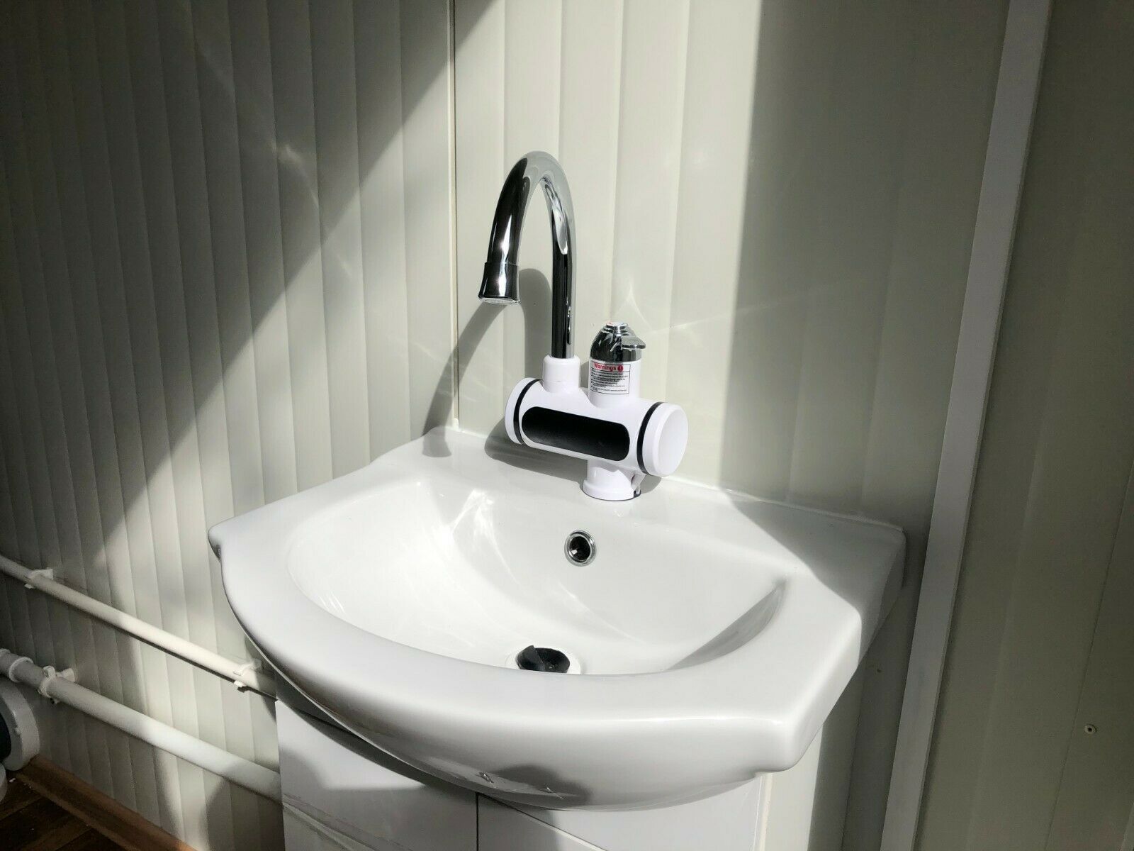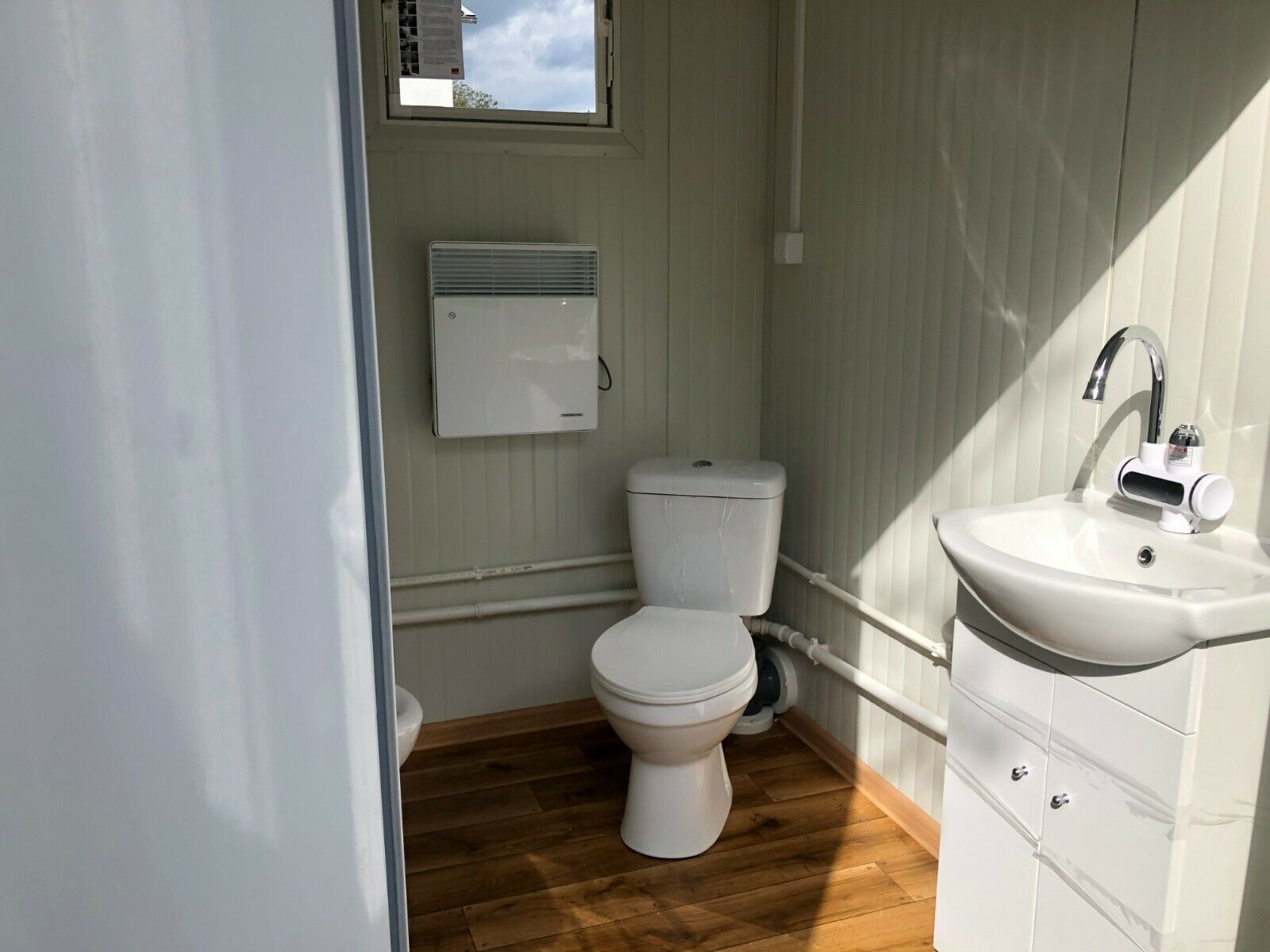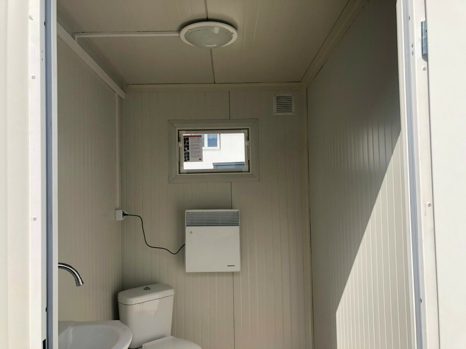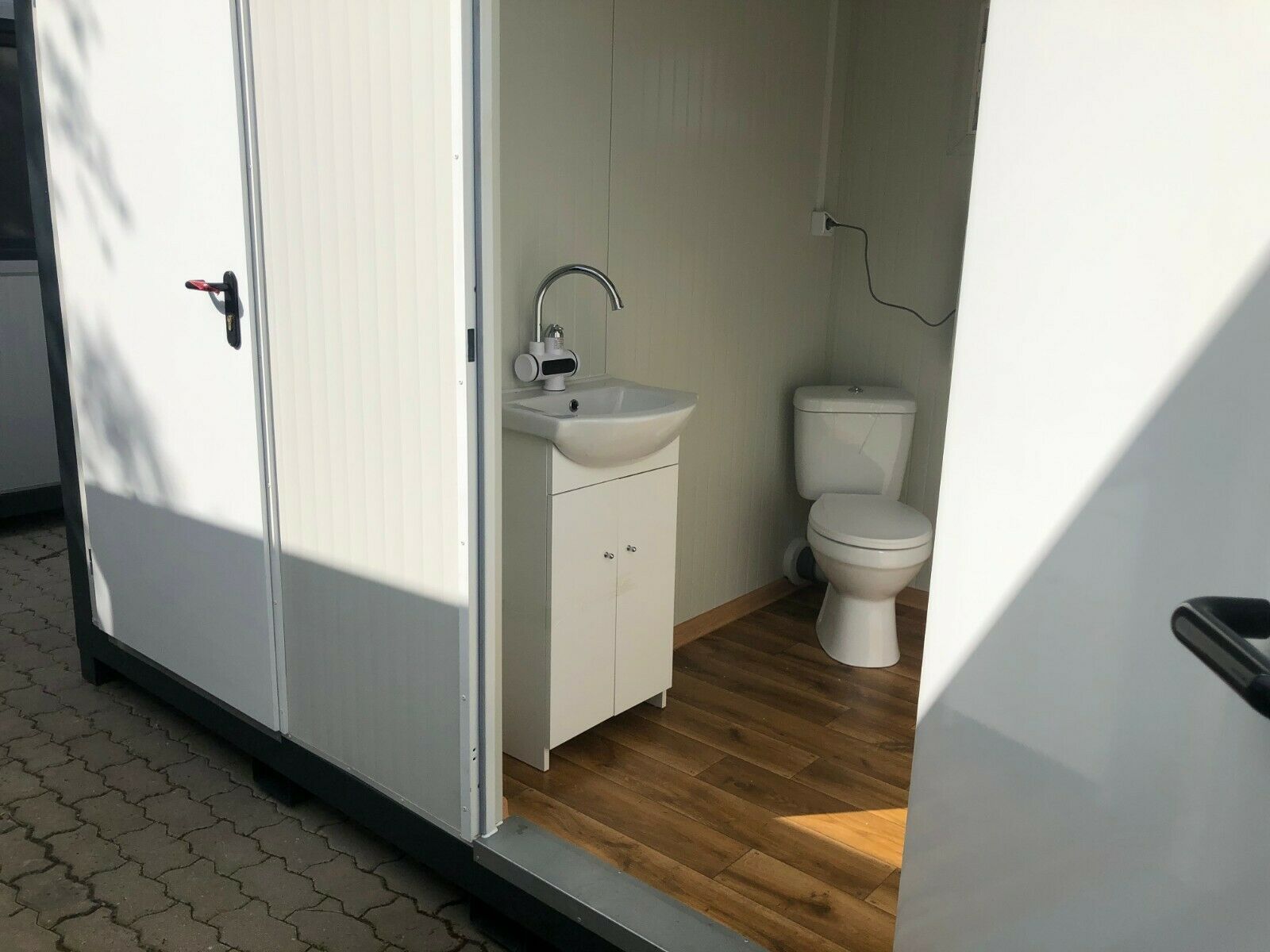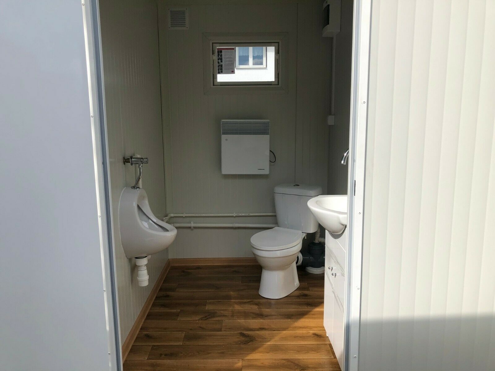 einfach anschließen- sofort einsatzbereit WC Doppelkabine 3x2 Meter. Modell KDWC3X2 mit Damen- und Herrentoilette - 2 Fenster - Wärmegedämmtes Sandwichprofil 75mm für geringen Energieverlust - verzinkte Hörmann Stahlblech Außentür - Komplette Elektroinstallation nach EG Richtlinien - Steckdosen 230V