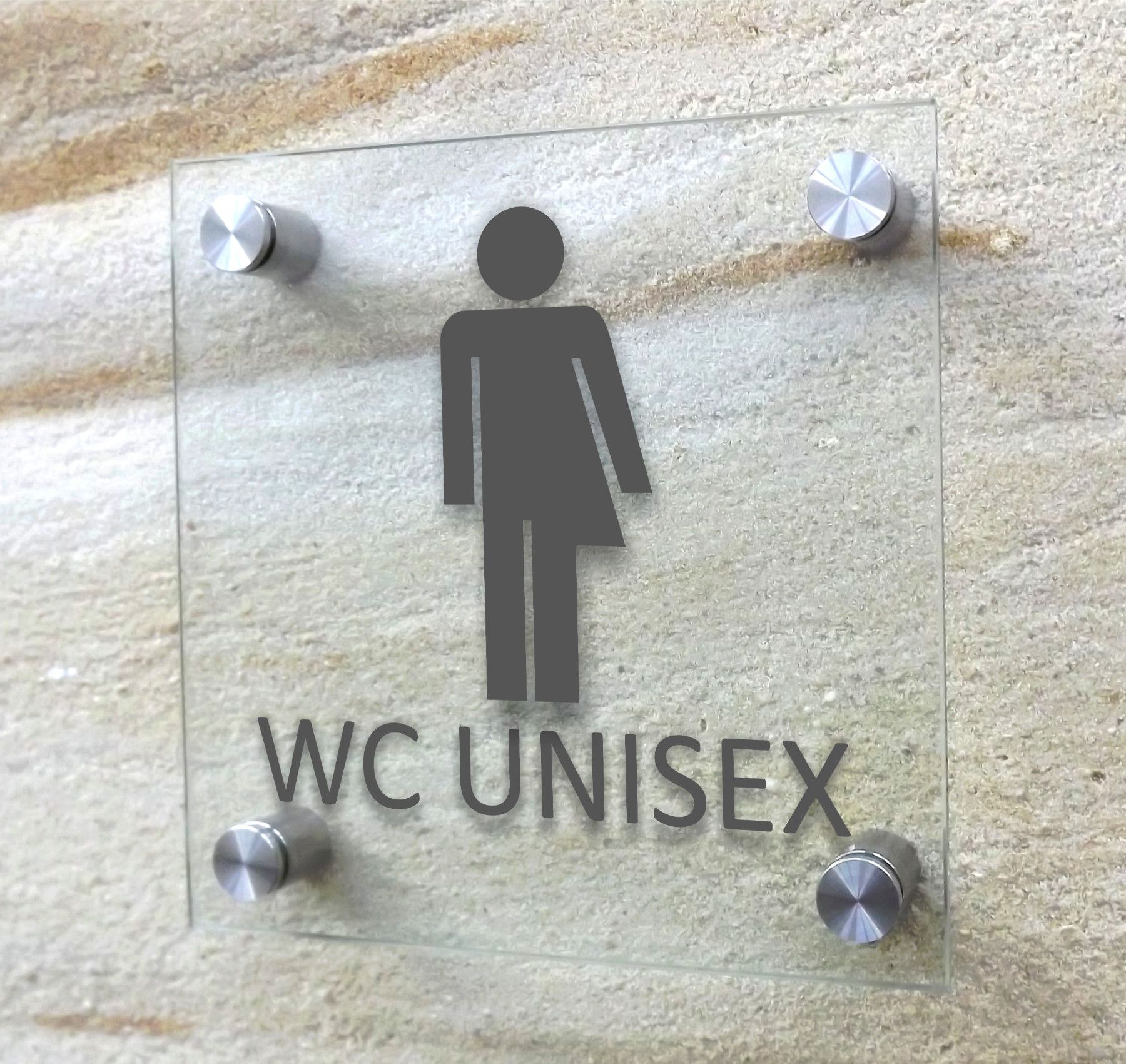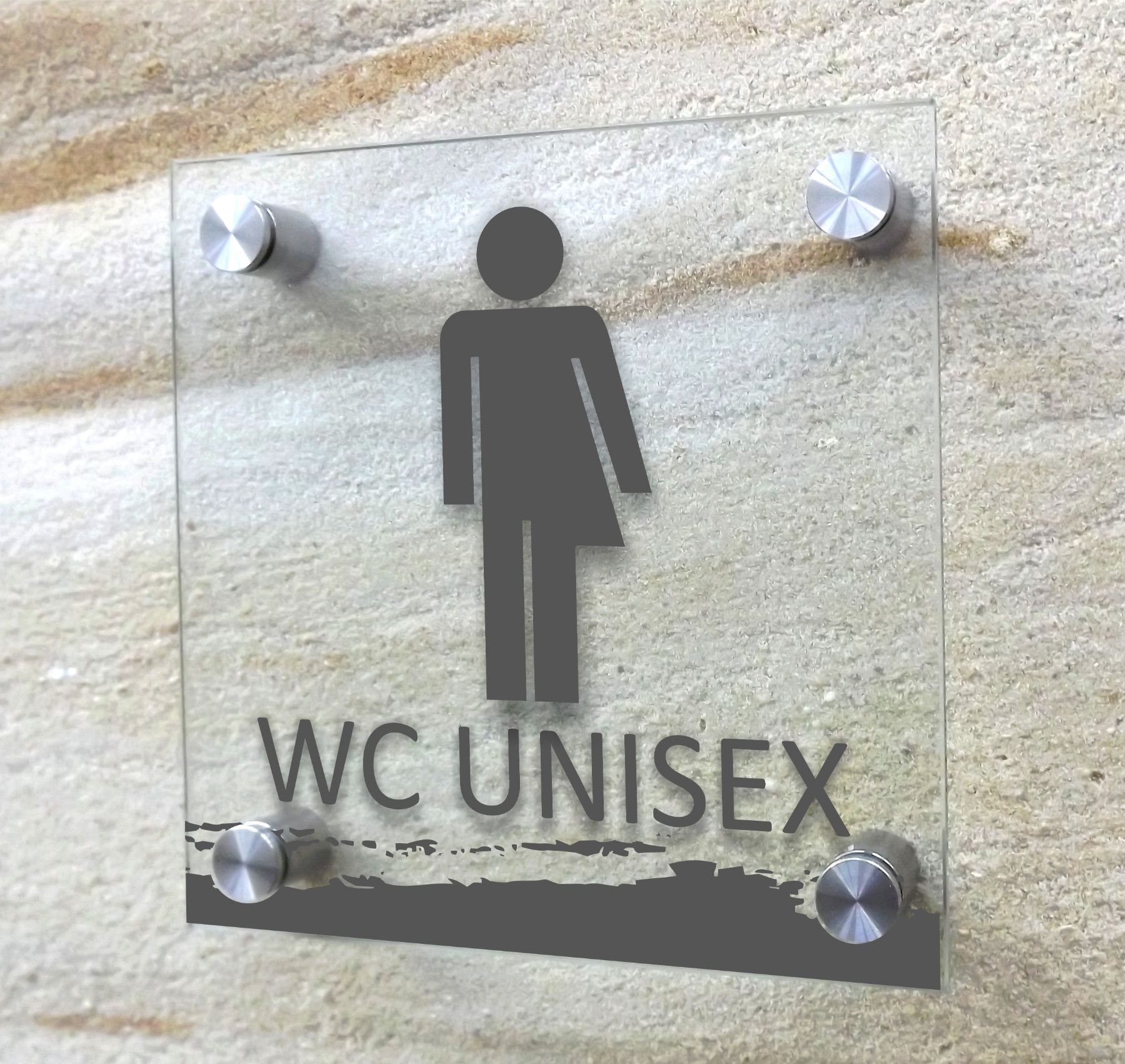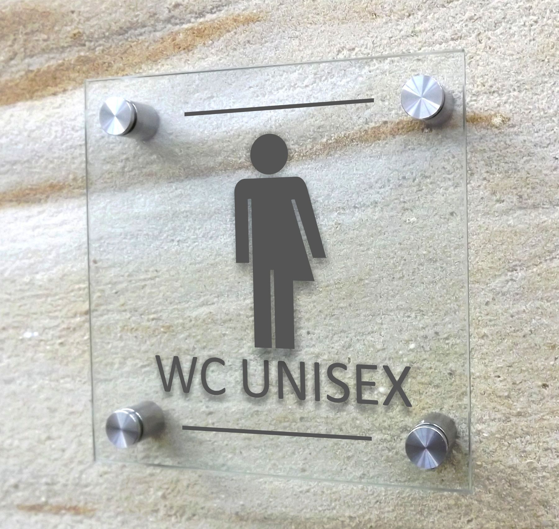 Edelstahl-Glasschild WC Unisex mit Schrift und Piktogramm (Designvarianten siehe oben) Ausführung Schildgröße: 150 x 150 mm absolute UV- und Witterungsbeständigkeit. Stecksystem mit Arretierung, manipulationssicher. optional 4 Edelstahl-Abstandshalter (Wandabstand 15mm) mit Montagematerial weitere S