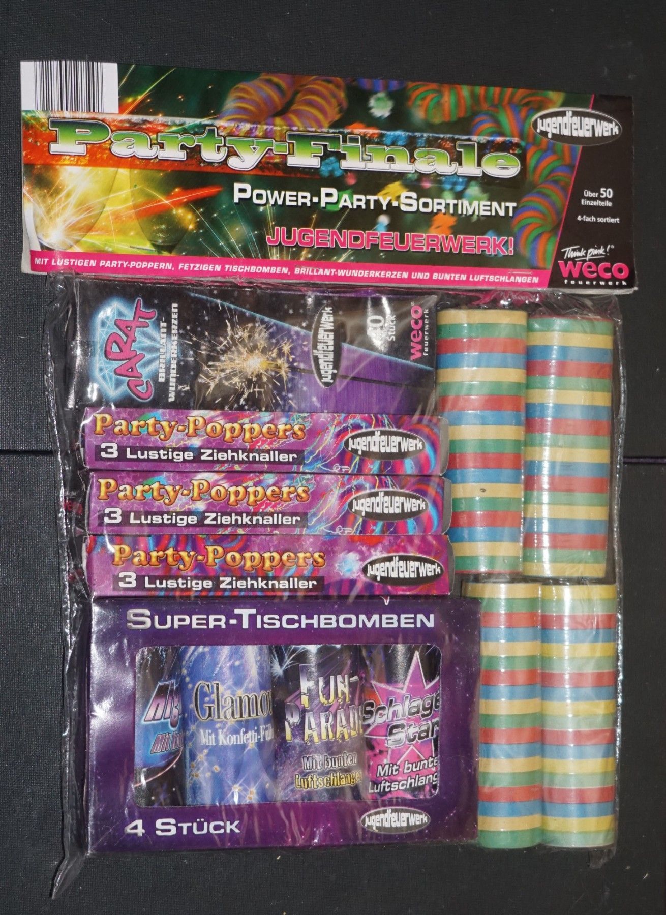 Sie bieten auf ein Sortiment Tischfeuerwerk von Weco, wie abgebildet Ein Sortiment enthält 4 Tischfeuerwerke, ca. 10 cm groß, 9 Party-Knaller, 40 Wunderkerzen ca. 16 cm und 4 Rollen Luftschlangen Ganzjahresfeuerwerk. Frei verkäuflich ab 12 Jahren