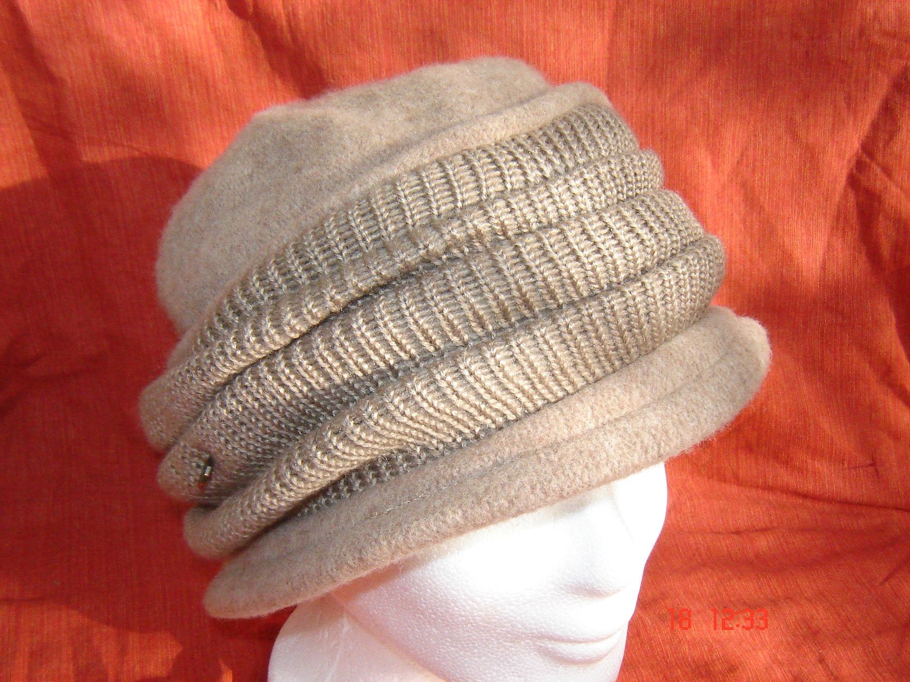 . . kuschlig warme Walkmütze doppelt dick , Walkmütze gearbeitet wie ein Hütchen mit schmalem Rand besetzt mit einem Strickrand für absolute Wärme hoch genug um sie über die Ohren zu ziehen sehr weiche Qualität aus 100% Wolle problemlose Handwäsche in Farbe hellbraun meliert . Größe passend für 56 b