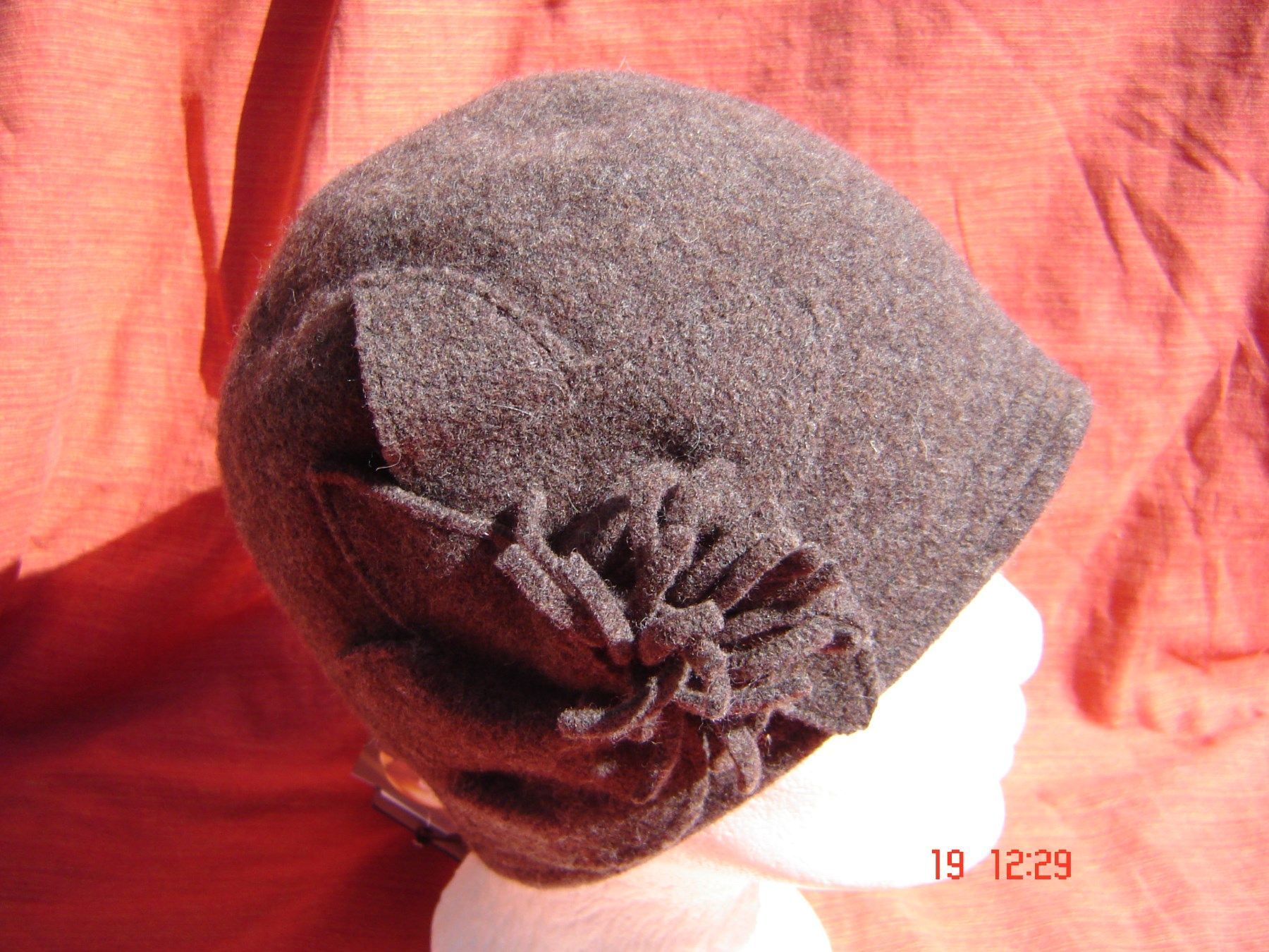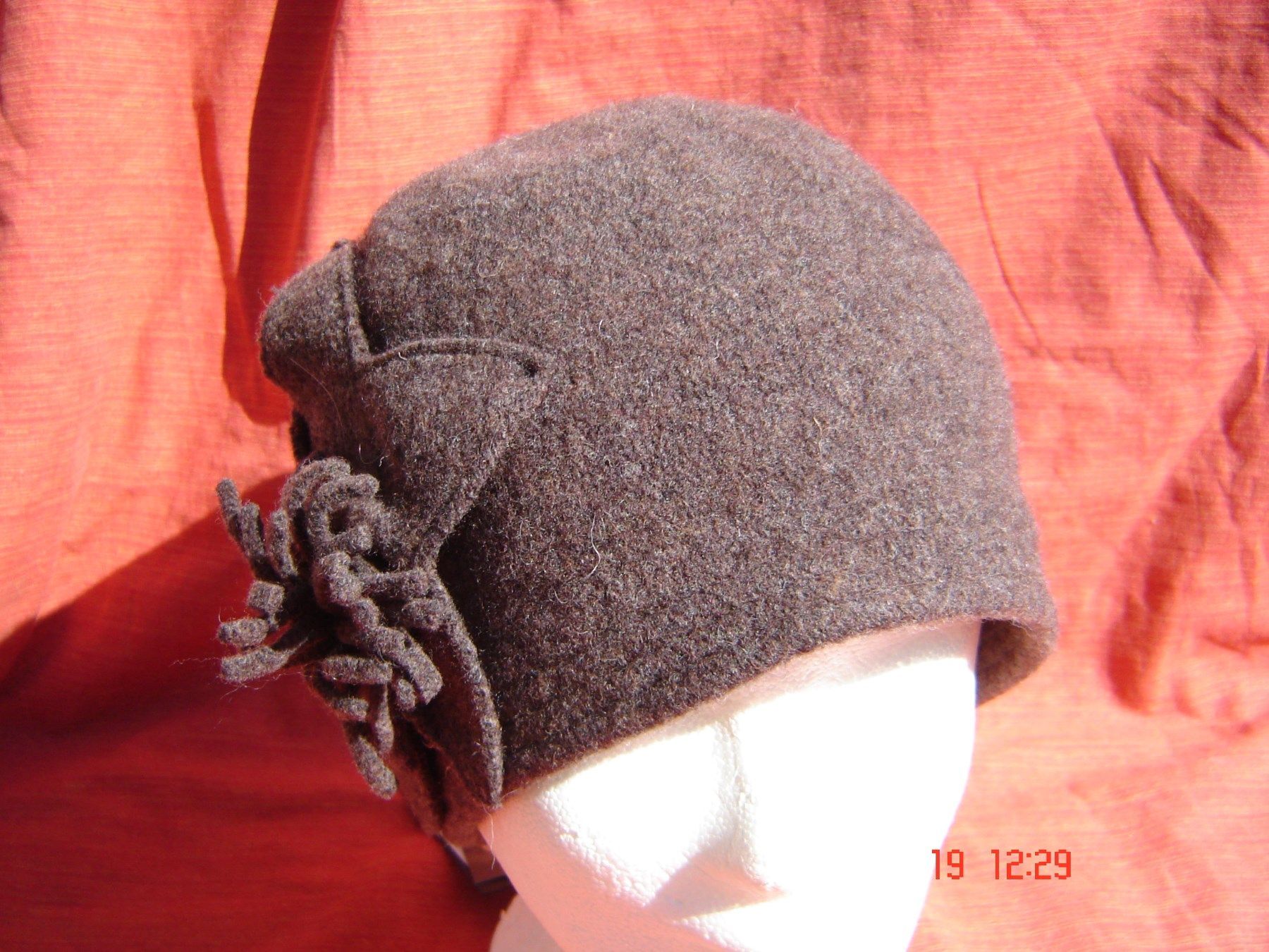 . . kuschlig warme Walkmütze schöne dekorative Walkmütze als Toque gearbeitet mit doppelt gestepptem Rand und einer großen Walkblüte sehr weiche Qualität aus 100% Wolle problemlose Handwäsche in Farbe braun meliert ausgezeichnete Verarbeitung der Firma Seeberger Größe passend für 56 bis 58 cm Kopfum