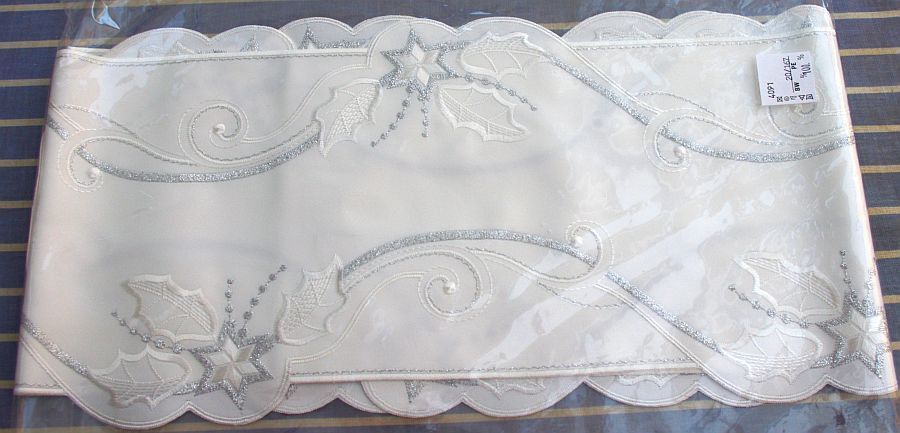 > Material: 100% Polyester, waschbar bis 30 Grad > Größe: 20*167 cm > Farbe: wollweiß, maschinelle Bestickung in den Farben wollweiß und Lurex-Silber