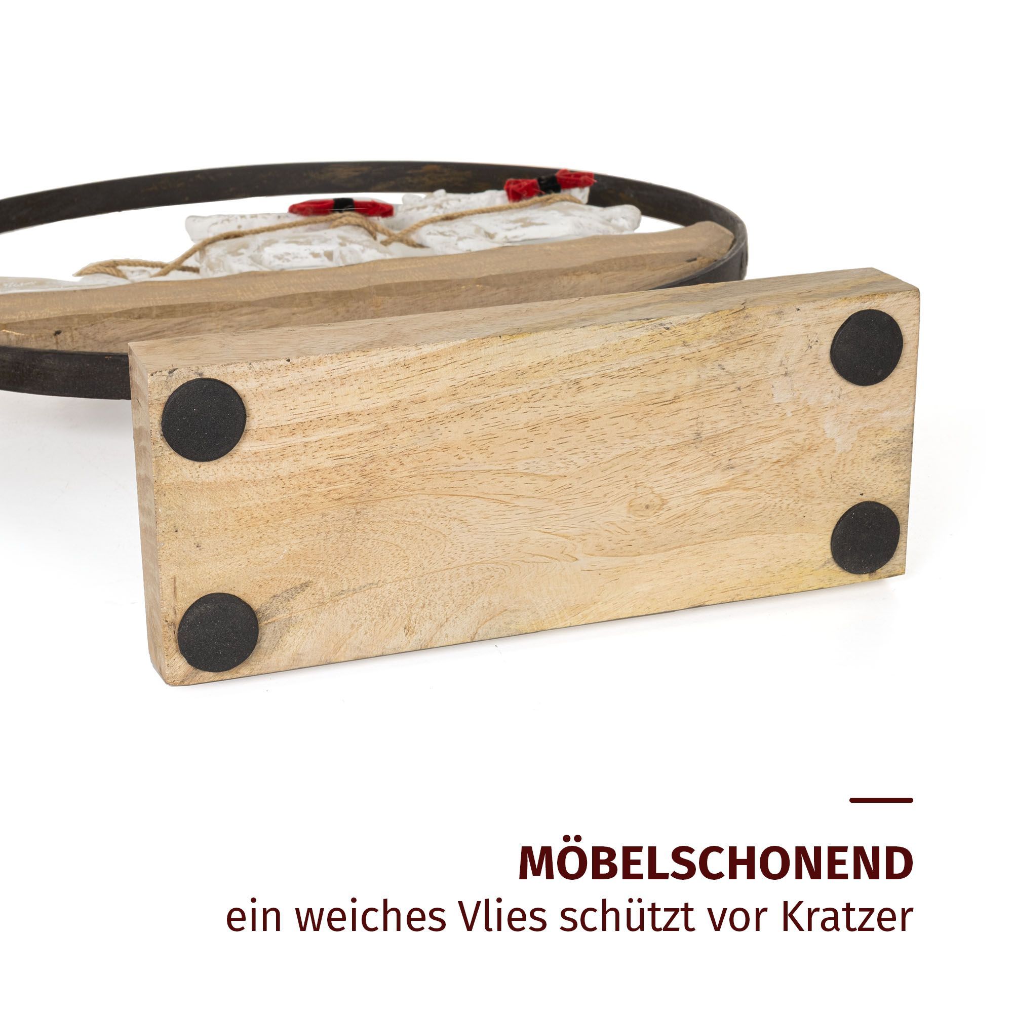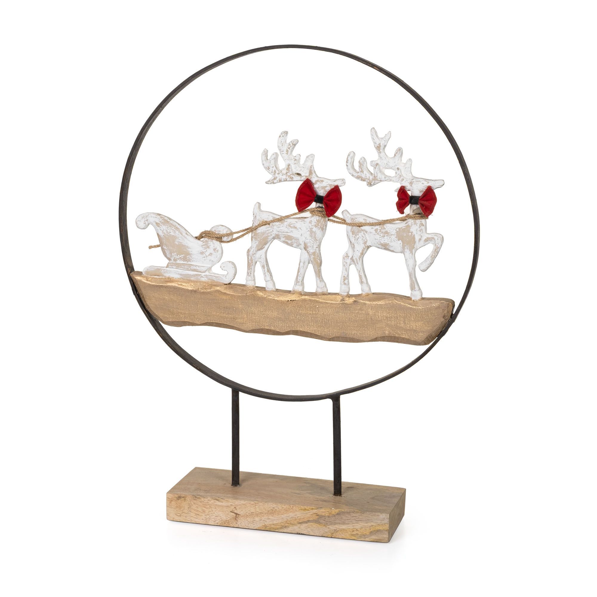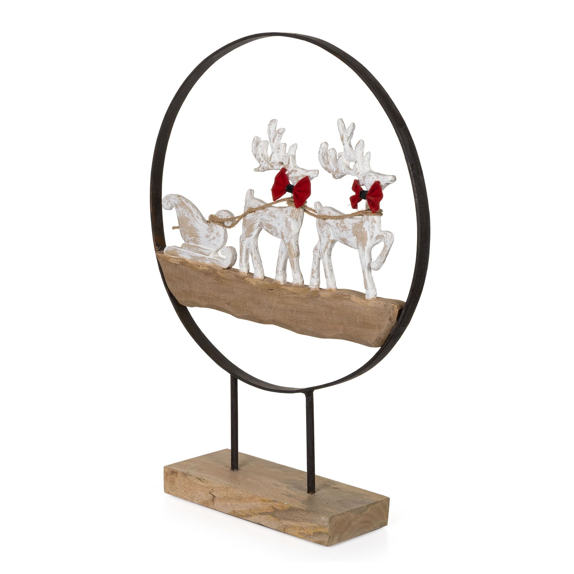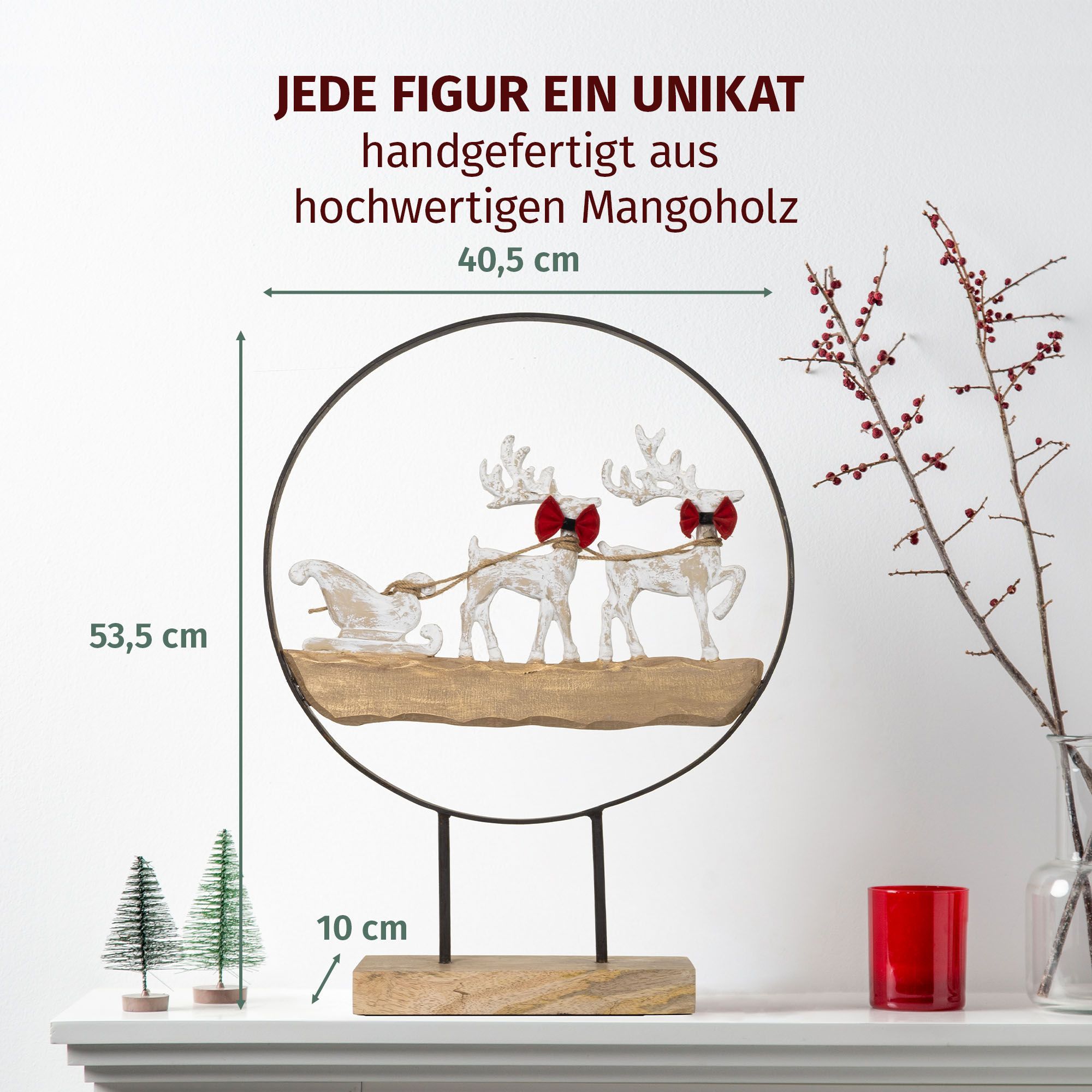 Weihnachtsdeko Rentier mit Schlitten im Metallring auf Mangoholzsockel 53,5 cm