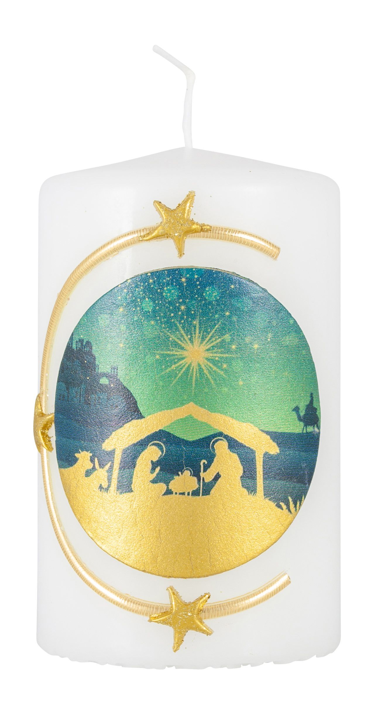 schön gestaltete Motivkerze mit Krippenmotiv blau/gold. Details zum Produkt: Größe: 10 x 6cm Material: Wachs