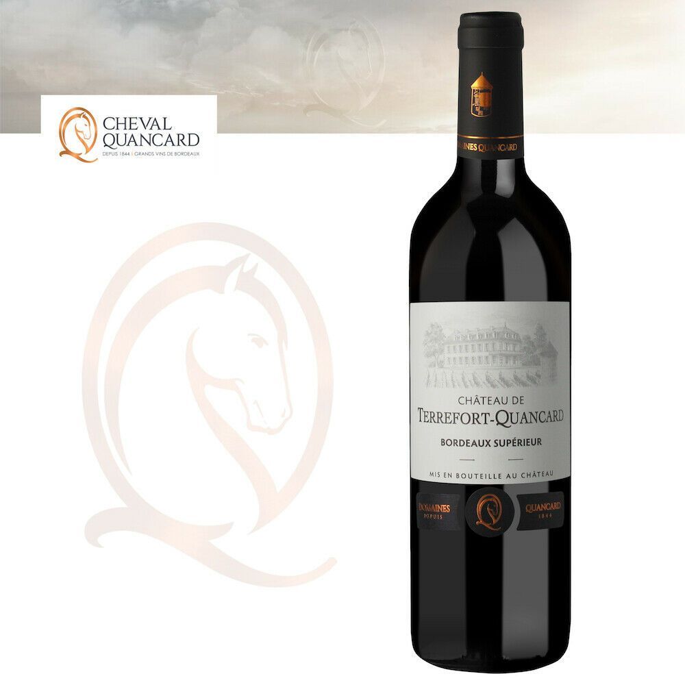 Château de Terrefort-Quancard Bordeaux Supérieur Rouge Jahrgang 2015 Dieser gehobene Gourmet-Wein eignet sich perfekt für die glanzvolle Festtags-Tafel wie auch für einen gemütlichen Abend am Kamin. Genießen Sie ein ausgewogenes und anspruchsvolles Bukett mit Noten von Waldboden, kandie