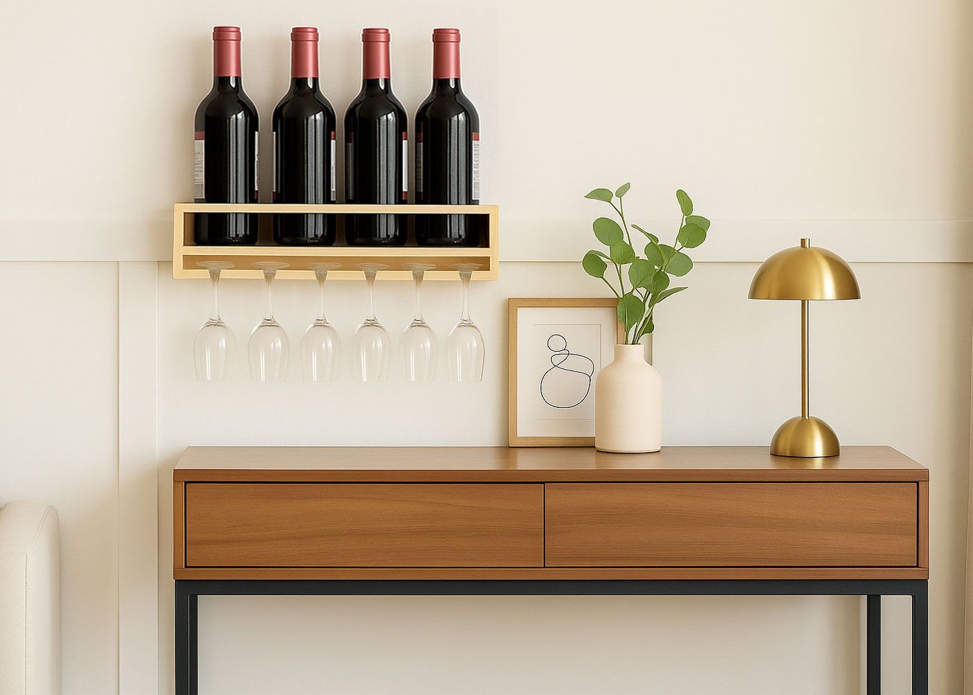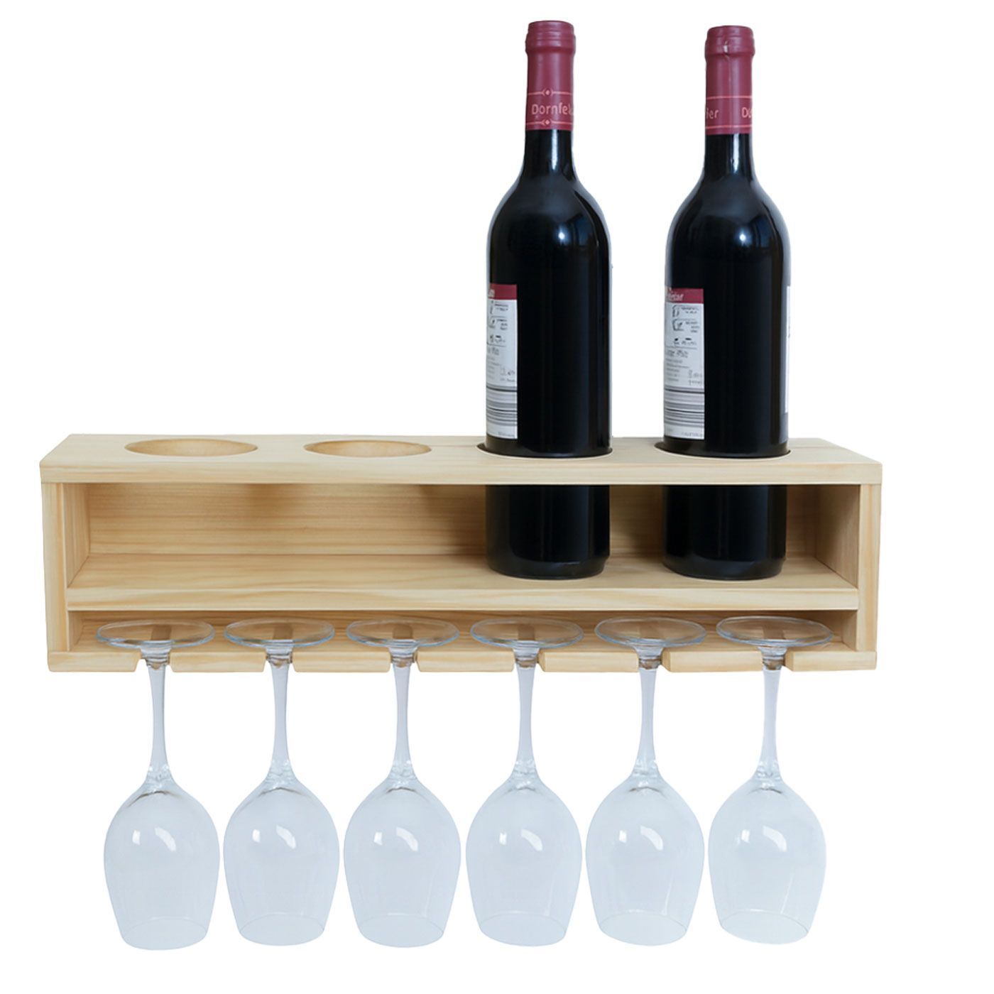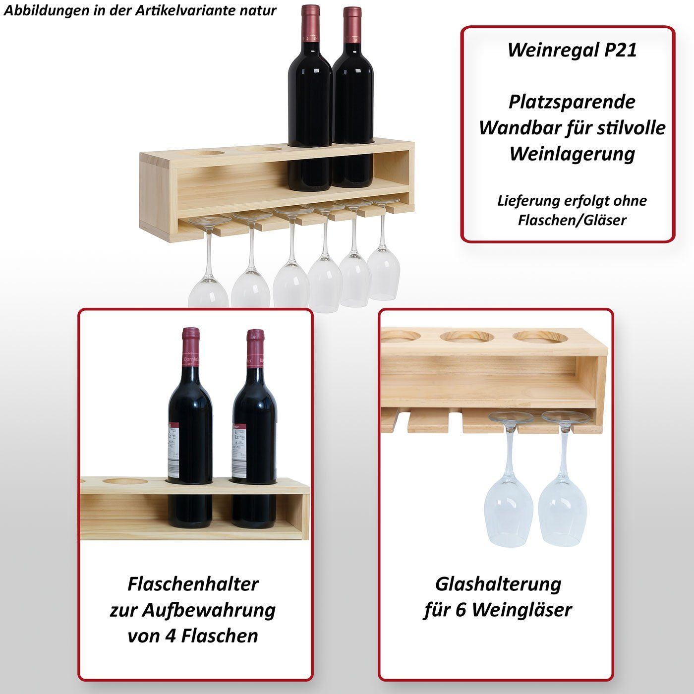 Mendler Weinregal HWC-P21, Wandbar für 4 Flaschen/6 Gläser Holz FSC®-zertifiziert 12x48x12cm
