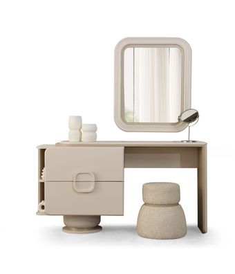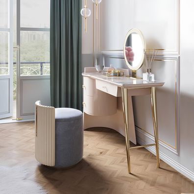Eleganter Beigefarbener Holz-Schminktisch mit Pouffe für Schlafzimmer
