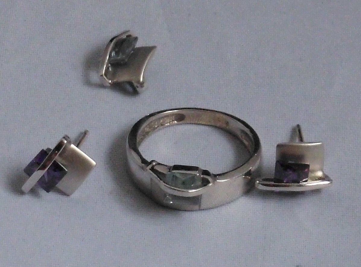 Das Set ist in einem neuwertigen Zustand und stabil und solide gearbeitet. Der Ring und der Anhänger haben vermutlichen einen Blautopas und die Ohrstecker einen Amethysten. Der Ring hat einen Innendurchmesser von 1,7 cm. Er ist Weißgold glänzend und am Ringkopf ist er matt gearbeitet. Ringkopf ist 8 mm. Der Anhänger und die Ohrstecker sind an der Bügelverzierung 11 mm. Auch 585 gestempelt. Die Ohrstecker haben keine Verschlüsse.